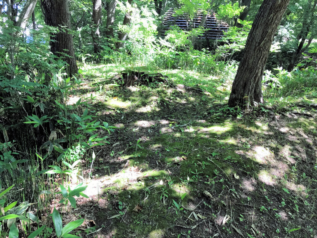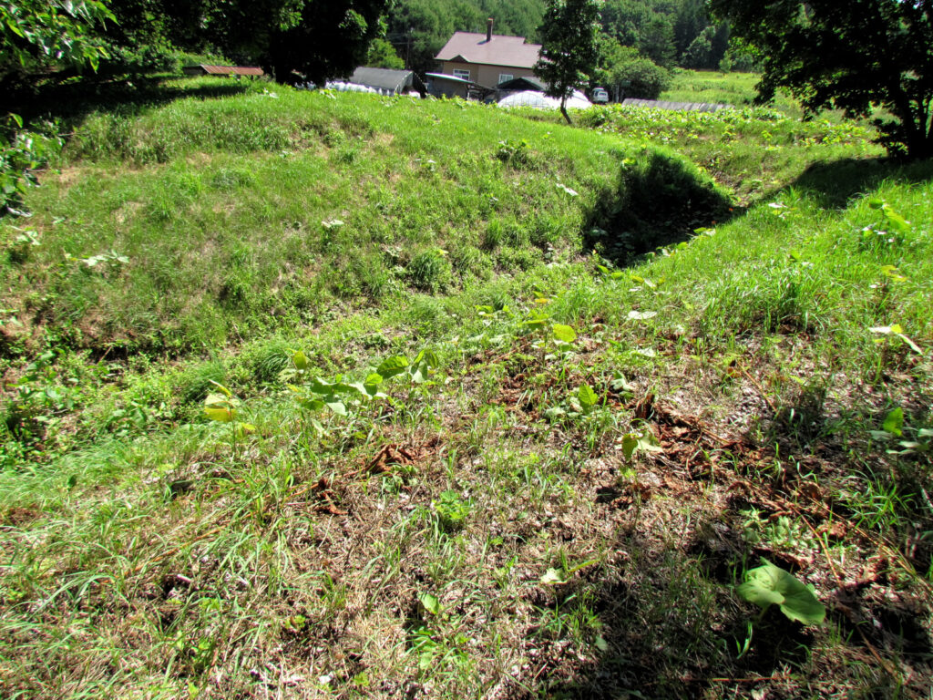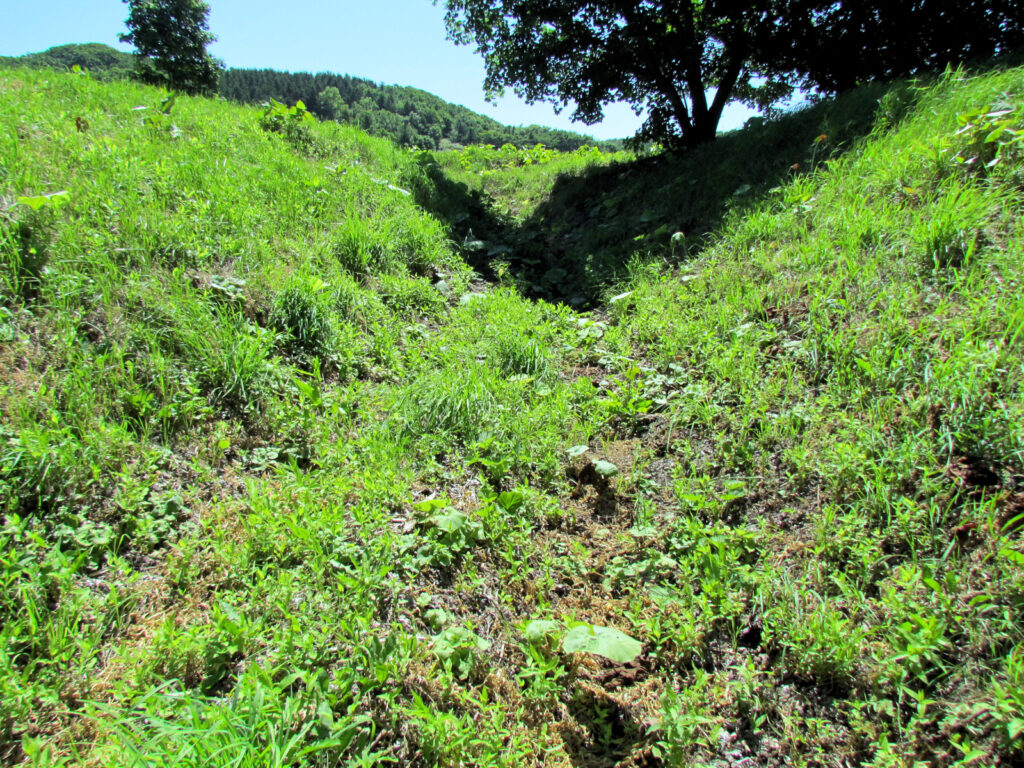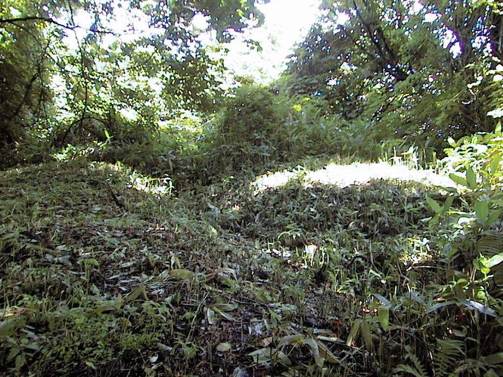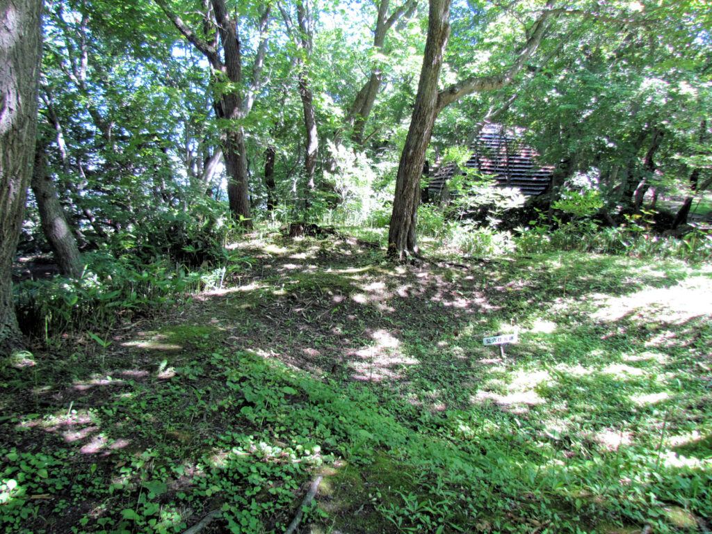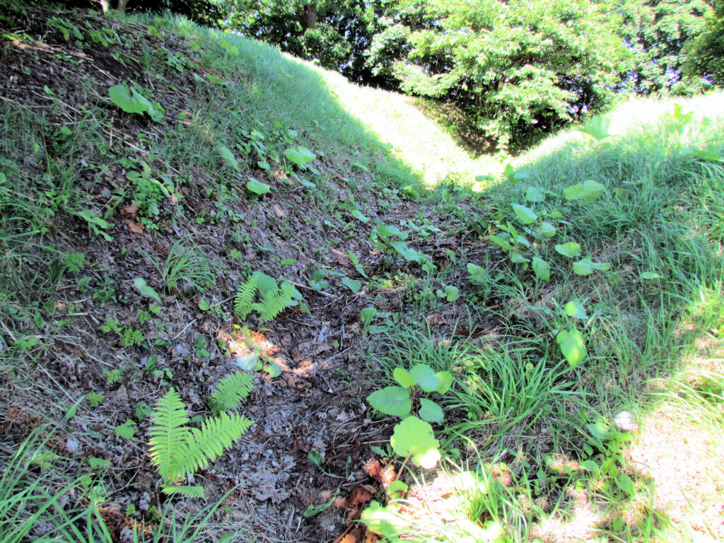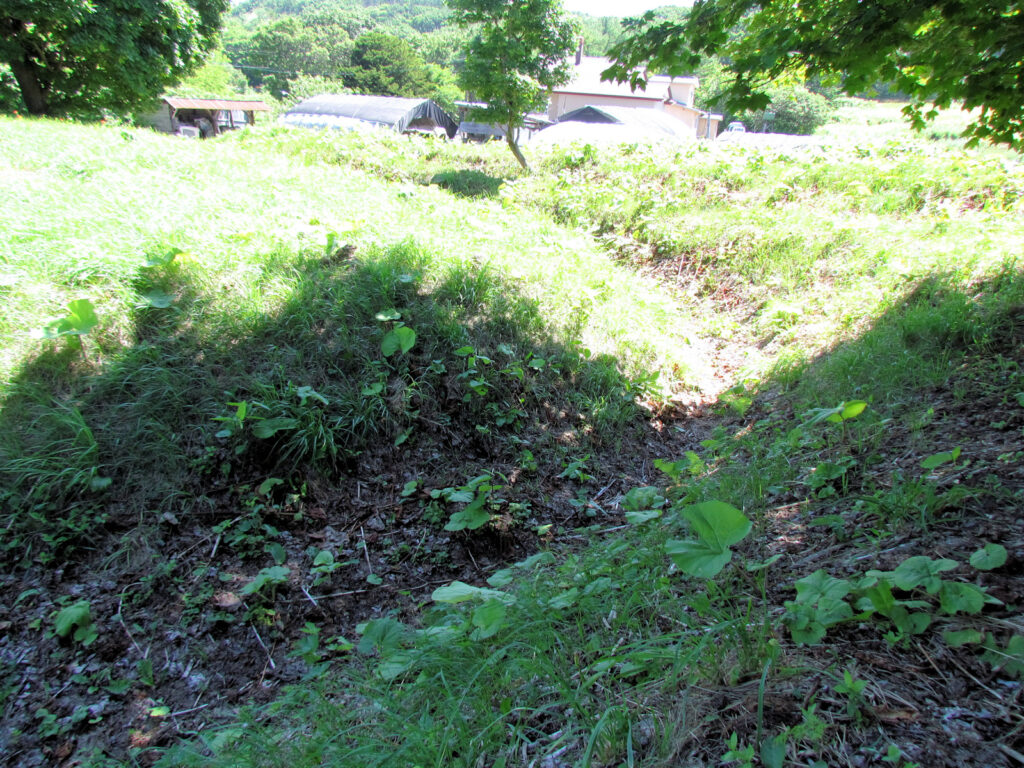 チャシのある台地の横の道を登ると草地になっていて、そこを進むと壕の一部と思われる窪みを見つけることができました。ですが、そこから先は藪になっていて進めませんでしたのでもう一ヶ所の壕跡は確認できませんでした。写真も撮りましたが、やっぱりワケのわからん写真になってしまいました(^^;)