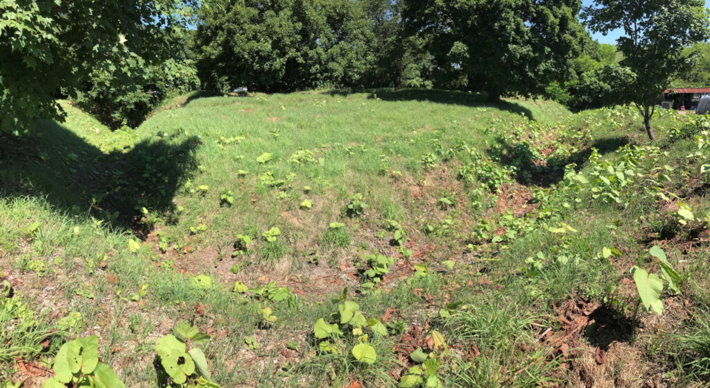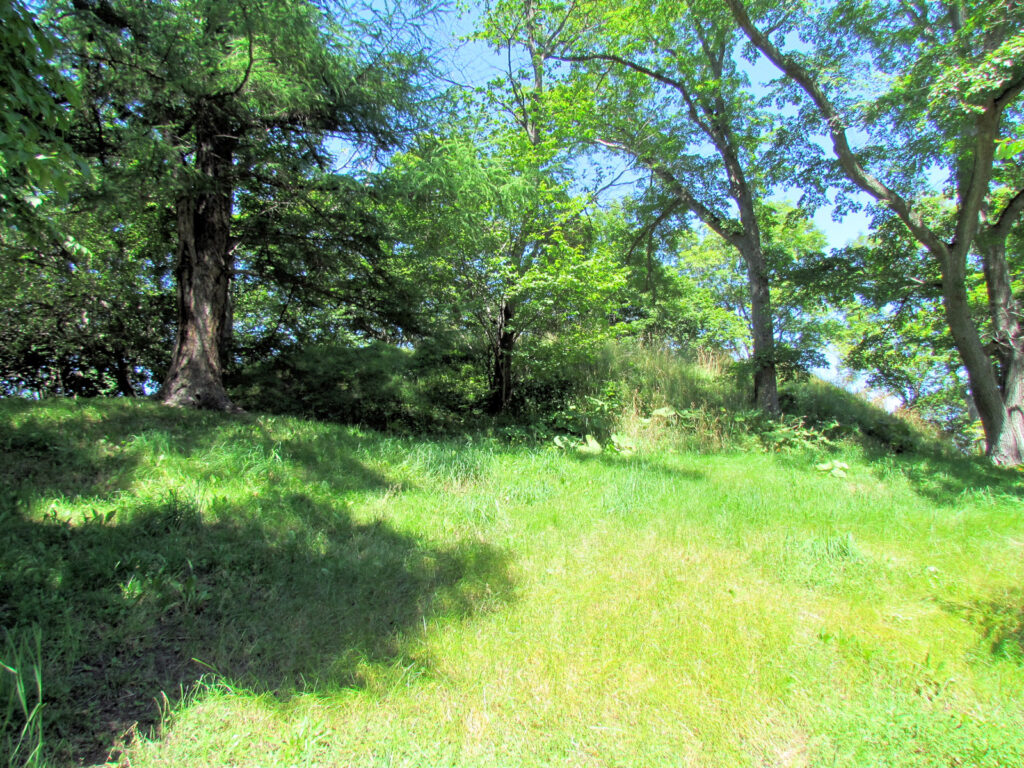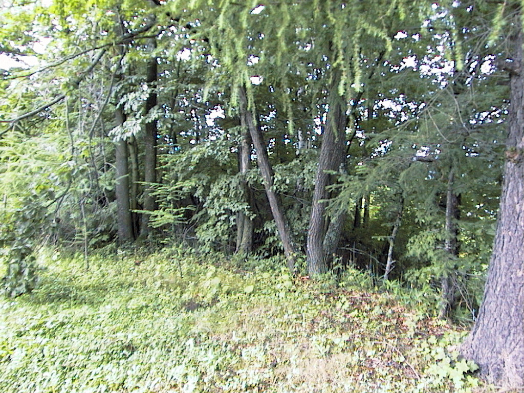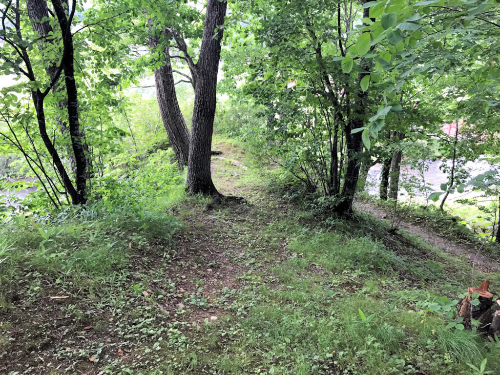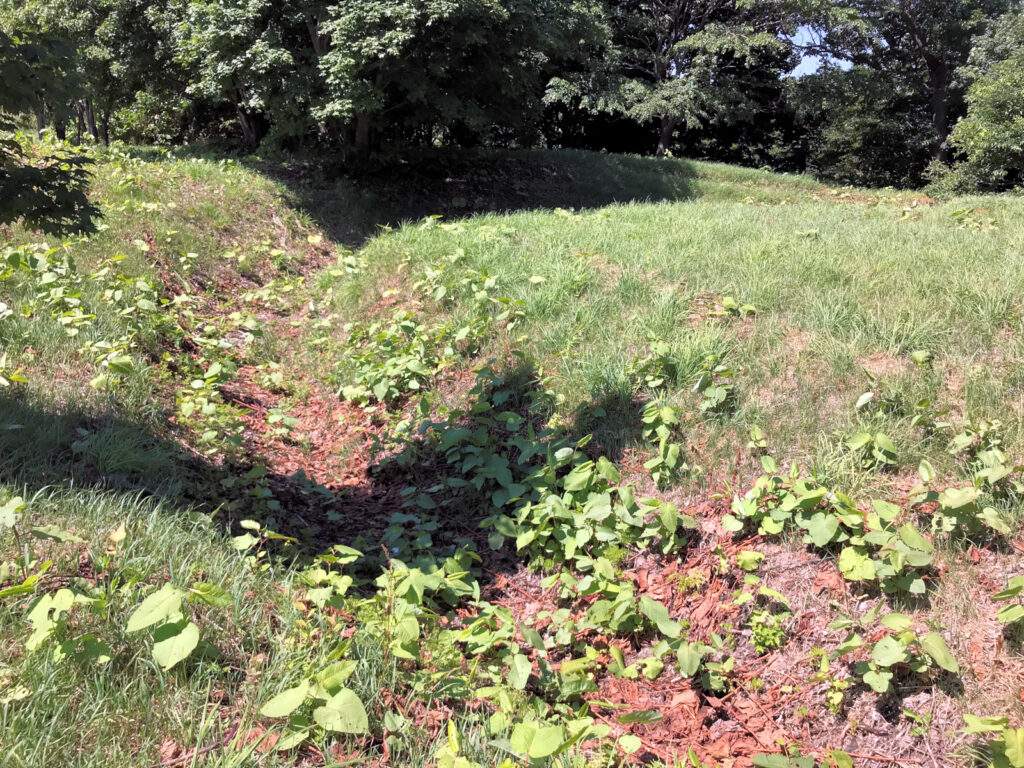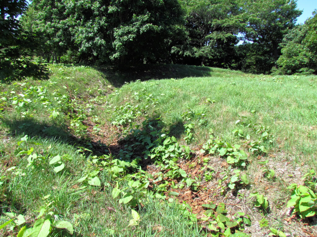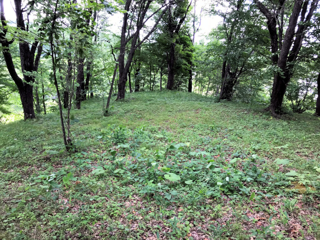 チャシのある台地の横の道を登ると草地になっていて、そこを進むと壕の一部と思われる窪みを見つけることができました。ですが、そこから先は藪になっていて進めませんでしたのでもう一ヶ所の壕跡は確認できませんでした。写真も撮りましたが、やっぱりワケのわからん写真になってしまいました(^^;)