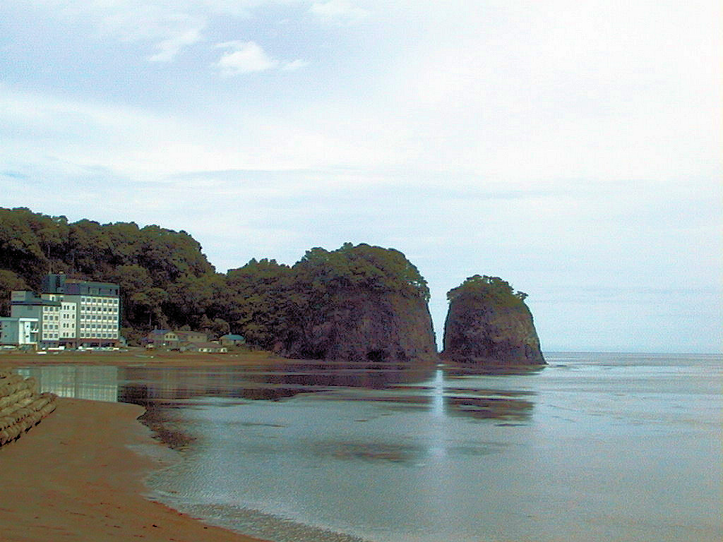 ピットカリチャシの場所からさらに北上すると、水族館を越えた辺りにオホーツク海に突き出すように二つの岩が向かい合うように立っているところがあります。これが二ツ岩で、手前の道路に近い方の岩が二ツ岩チャシです。岩の根本の方に壕があるようですが、道路の丁度カーブの場所でしたので車を止めるわけにもいかず、通りすがりに眺めただけで終わってしまいました。