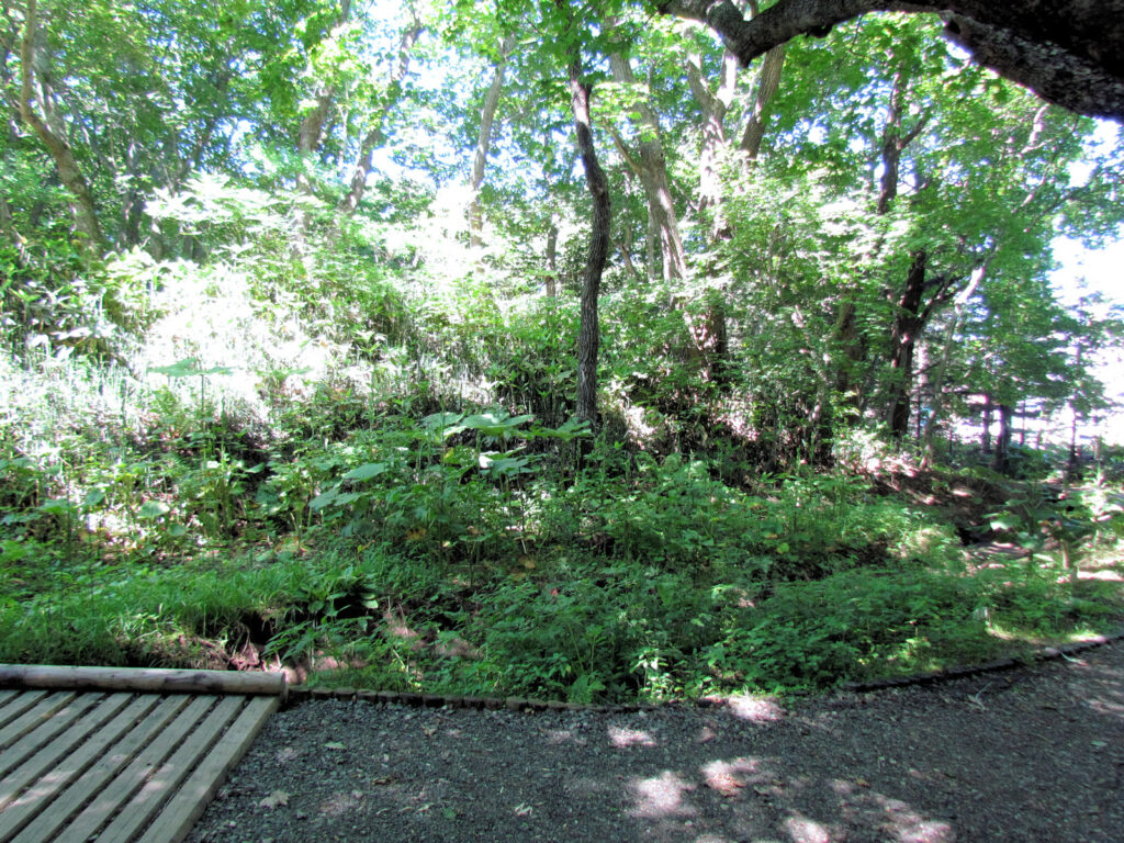チャシ周辺は森林となっていて遊歩道が通り、私が行ったときには丁度草刈をしたばかりでした。草が刈ってあったのは壕のあたりまでで、チャシ本体は草が生えたままになっていました。壕は一応確認できましたが、とても浅く壕というよりは溝程度のものでした。