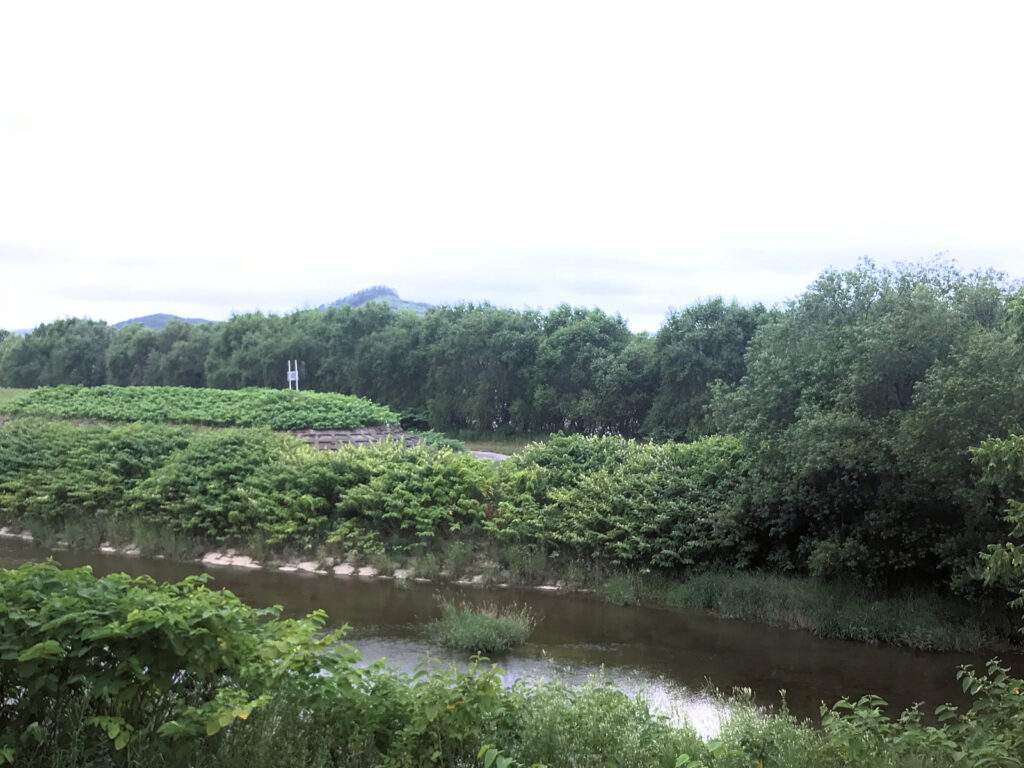 オホーツク旅行一日目、道の駅かみゆうべつ温泉チューリップの湯を訪れた後、湧別川方面に移動しチャシを捜してみました。まずは湧別川の対岸から遠景を臨み、堤防の上に出られそうだったので、堤防の上から対岸を眺めてみました。続いて湧別川を渡り、橋のたもとからチャシ方面の遠景を撮りました。