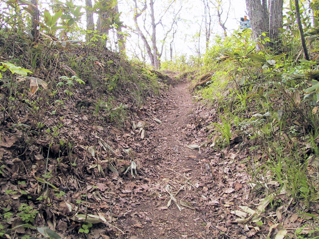 この日はお城めぐりMLの菅原さんと深川・旭川周辺のチャシ巡りをしました。立岩山チャシをあとにして、今度は嵐山チャシへと向かいます。立岩山チャシのすぐ下の辺りから眺めると丁度舌状台地が突き出しているのがよくわかります(写真3)。裏側から嵐山展望台の方へと登り、頂上の駐車場に車を止め、嵐山チャシの方へと今度は遊歩道を下っていきます。途中にチセが建っていた跡(いまは看板しかない)があり、15分ほど下っていくとチャシのある場所にたどり着きます。嵐山チャシという看板はありませんが、案内地図に現在位置が○で記され、そこにチャシコツ(チャシ跡)と書かれています。その案内地図があるところから左下に降りていく道がありますが、どうもその道が壕跡らしく見えますが、定かではありません。『北海道のチャシ』では「空壕1条」とありますが、北海道チャシ学会の「北海道におけるチャシ跡遺跡一覧表」には壕のところが空欄になっていますので、チャシ学会としてもはっきりしていないようです。