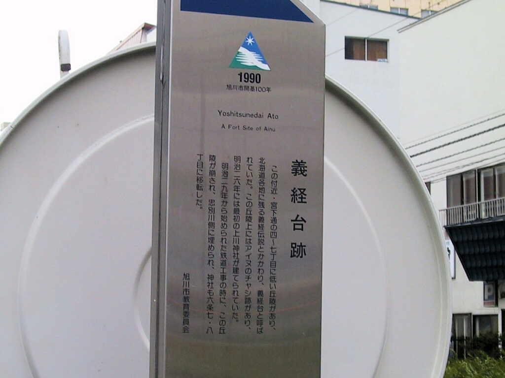 この日はお城めぐりMLの菅原さんと深川・旭川周辺のチャシ巡りをしました。オトゥイパウシチャシをあとにして、旭川駅方面へ向かいました。この忠別川右岸チャシは現在の旭川駅のすぐ近くにありましたが、市街地の中心部にあったことからかなり早い頃に破壊されてしまったようで、『北海道のチャシ』にもチャシ学会の「チャシ跡遺跡一覧表」にも遺構ははっきりと書かれていません。このチャシがあった辺りは義経伝説とかかわりがあったようでかつては義経台と呼ばれたようで、駅の近くに「義経台跡」の説明板があります。