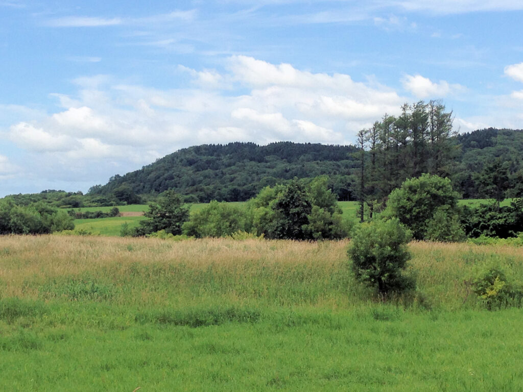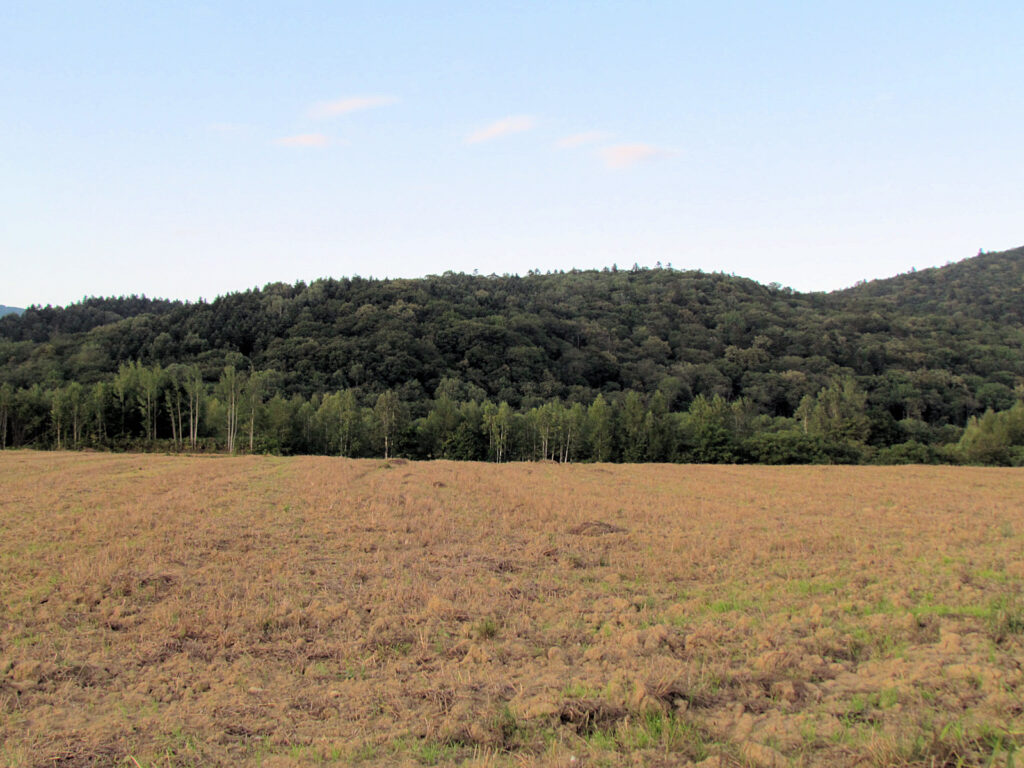 最初は、礼受牧場の方から近づけないかと進んでみましたが、途中で柵が閉まっていて断念。国道231号線に戻り、途中で礼受小学校(7年ほど前に閉校になったらしい)の裏の方かと思って写真を撮ったりしましたが、どうも地図と位置があわないので、もう少し先に進んだところ、それらしい沢が見えたので、たぶんここだろうと判断し写真を収めました。チャシ学会の会報に載っていた平面図を見ると、二つの台地の間の沢の奥の方にある舌状台地にチャシがあるようなので、下の写真の中央部の奥に見える台地がそれではないかと思いますが、定かではありません。この奥まった台地を横切るように一条の壕と段差があるそうです。