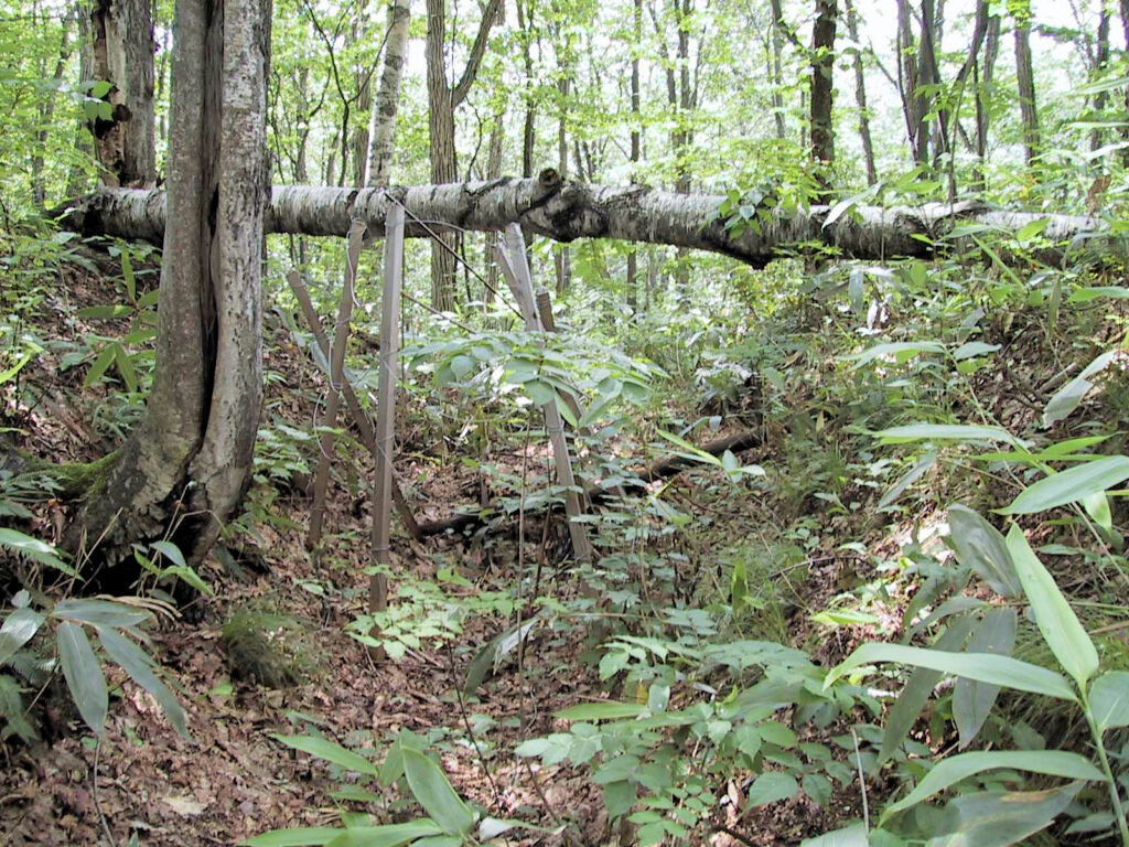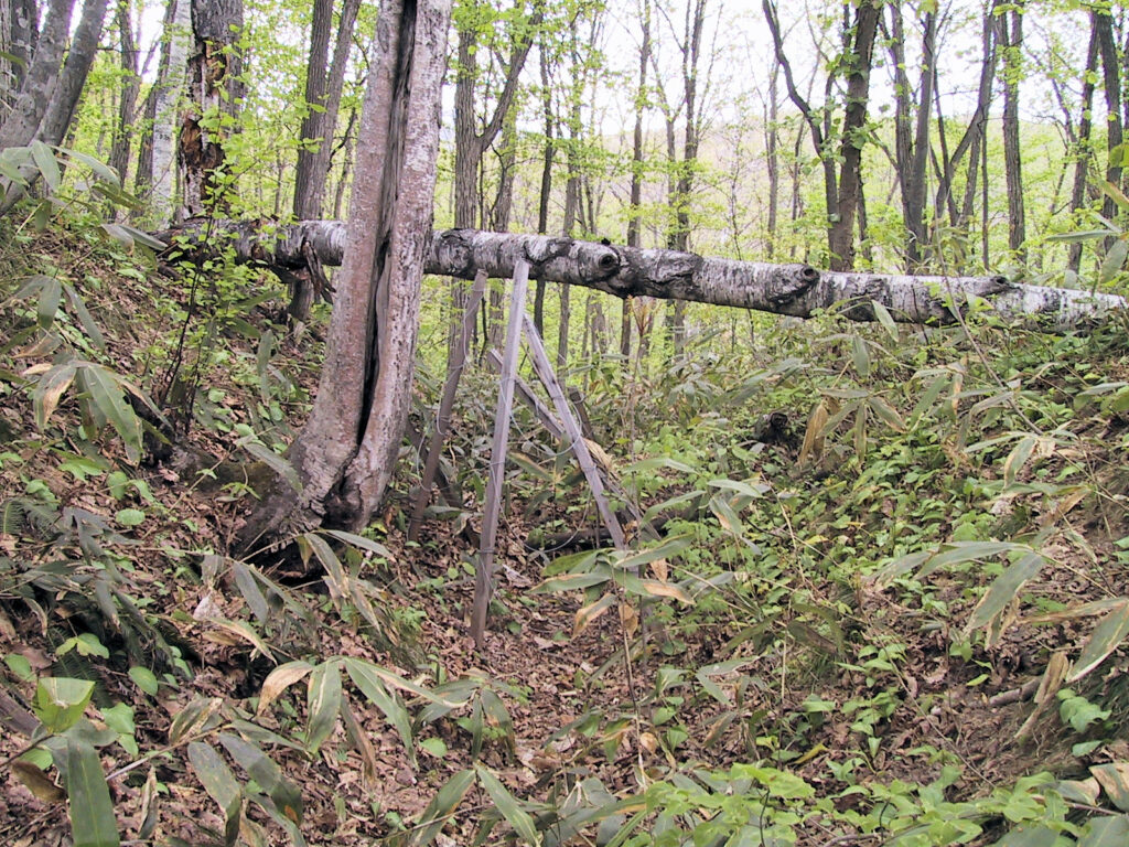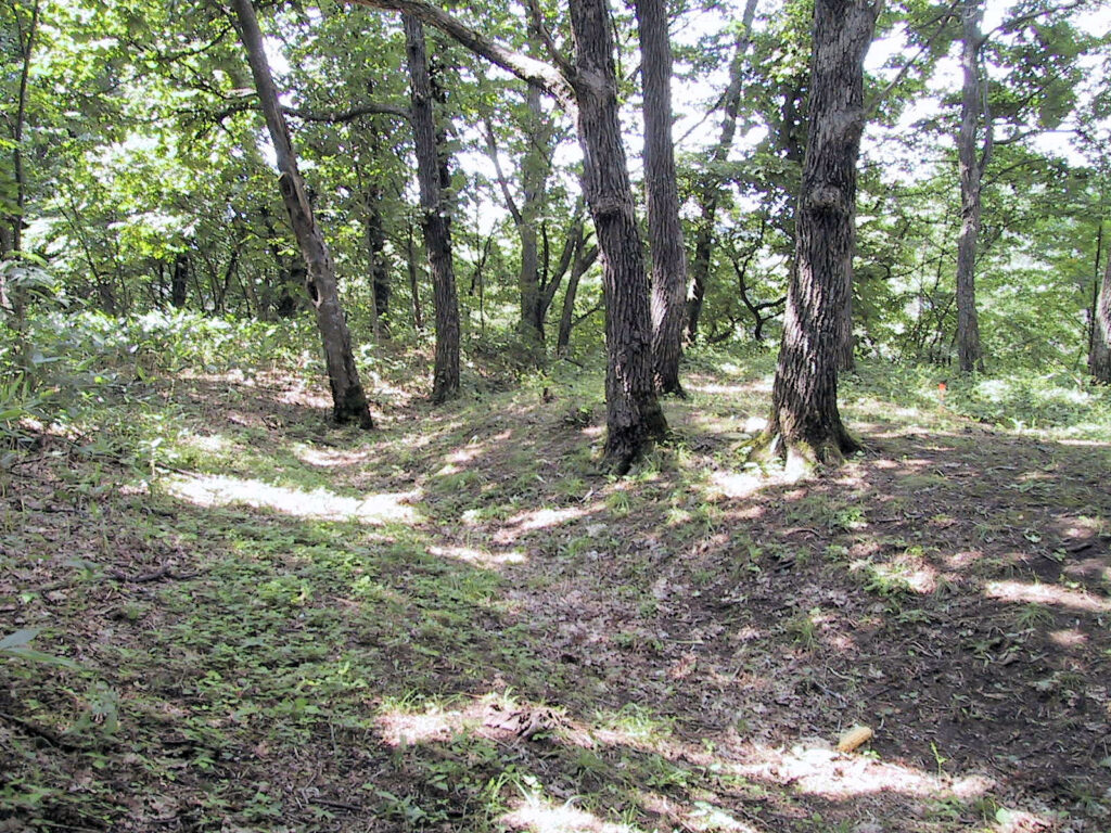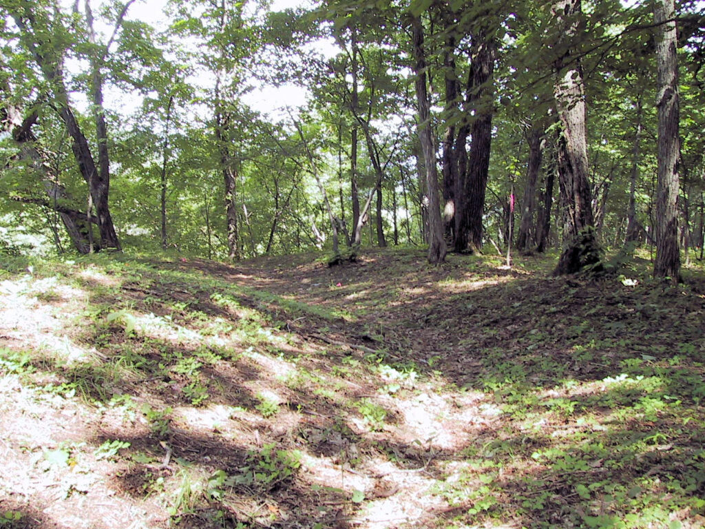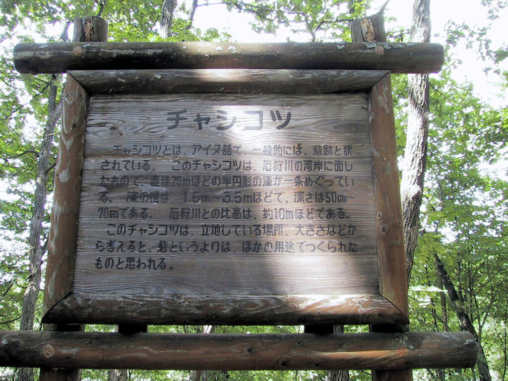 壕で区切られた部分の内部の広さは8畳~10畳ほどで、それほどひろくありませんが、『北の考古学散歩』によると内部に竪穴が四軒あったそうです。また壕も浅くて、かえって住居跡の竪穴の方が深かったりするぐらいですので、このチャシは戦闘目的に作られた砦というよりは鮭漁の際の見張り場などに使われたと考えるのが妥当だと思います。