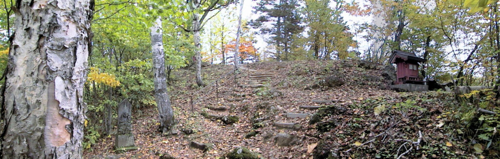 旭川の中心部の手前の神居古潭に、神居古潭左岸チャシ・神居古潭右岸チャシ・神居古潭チャシという三つのチャシがあるとのことなので神居古潭へと向かいました。左岸チャシがあるとおぼしき辺りに登り口がありましたが、「ストーンサークル入口」とか「○○観音」とかいう表示に?と思いつつ、登り始めました。頂上に到着しましたが、たしかに観音様らしき像や石仏が周囲にあるけれど、それだけ。チャシらしき堀などは見つからず...(; 😉 仕方ないのでそのまま下まで降りました。後から「城郭体系」を見たら、ちゃんと「壕は認められない」と書いてありました(^^;) (1999/10/11)
