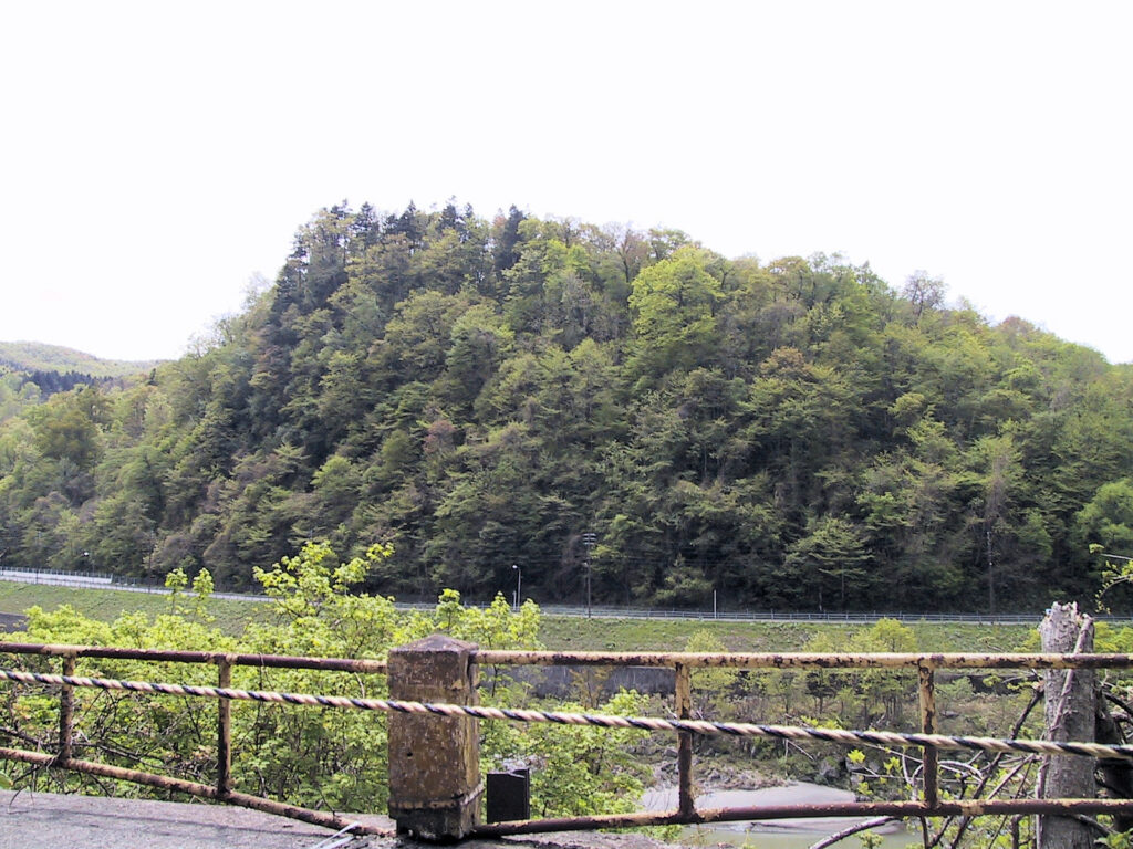 チャシ主体部には「たて穴跡」の看板があるだけで、ほかに見るべきものはありませんが、対岸にある立岩山チャシが木々の狭間からですが一望できました。(2002/5/12)