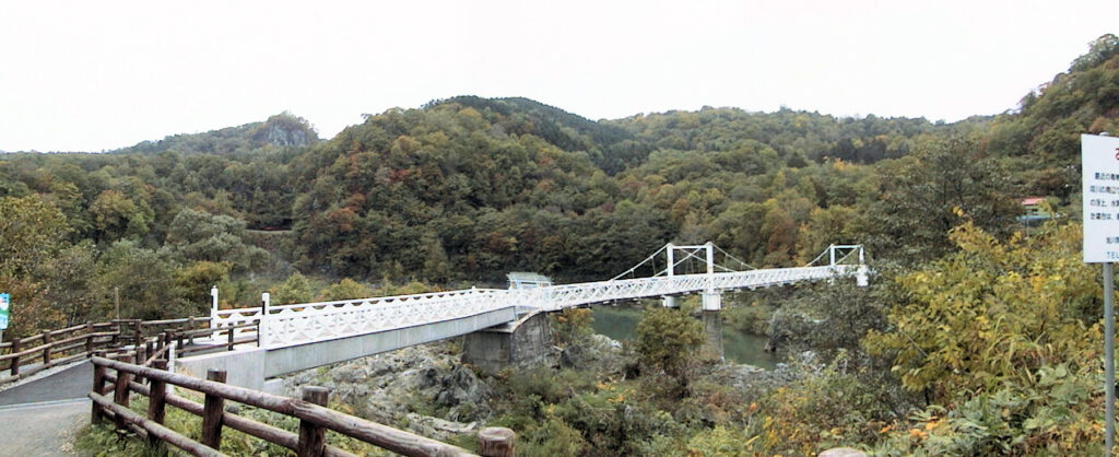 近くにあった案内地図を見ると、対岸にある神居岩という山の所に「サマイクル砦址」の文字を発見。これがたぶん右岸チャシのことだろうと思い、目の前にある吊り橋を渡ろうとすると、吊り橋は危険なため現在閉鎖中との看板が... 仕方ないので写真だけ撮って次へ移動しました。これまた、あとから「城郭体系」を見たら、「神居岩チャシ」というのが出ていたので、神居岩と右岸チャシは別なのでしょう。地形図を見ると左岸チャシと向かい合うように突き出た丘陵が対岸にあるので、これが右岸チャシなのかもしれません。(1999/10/11)