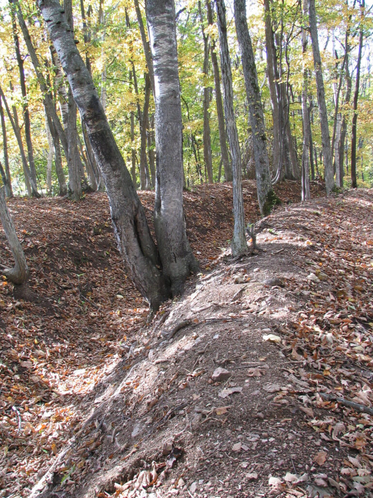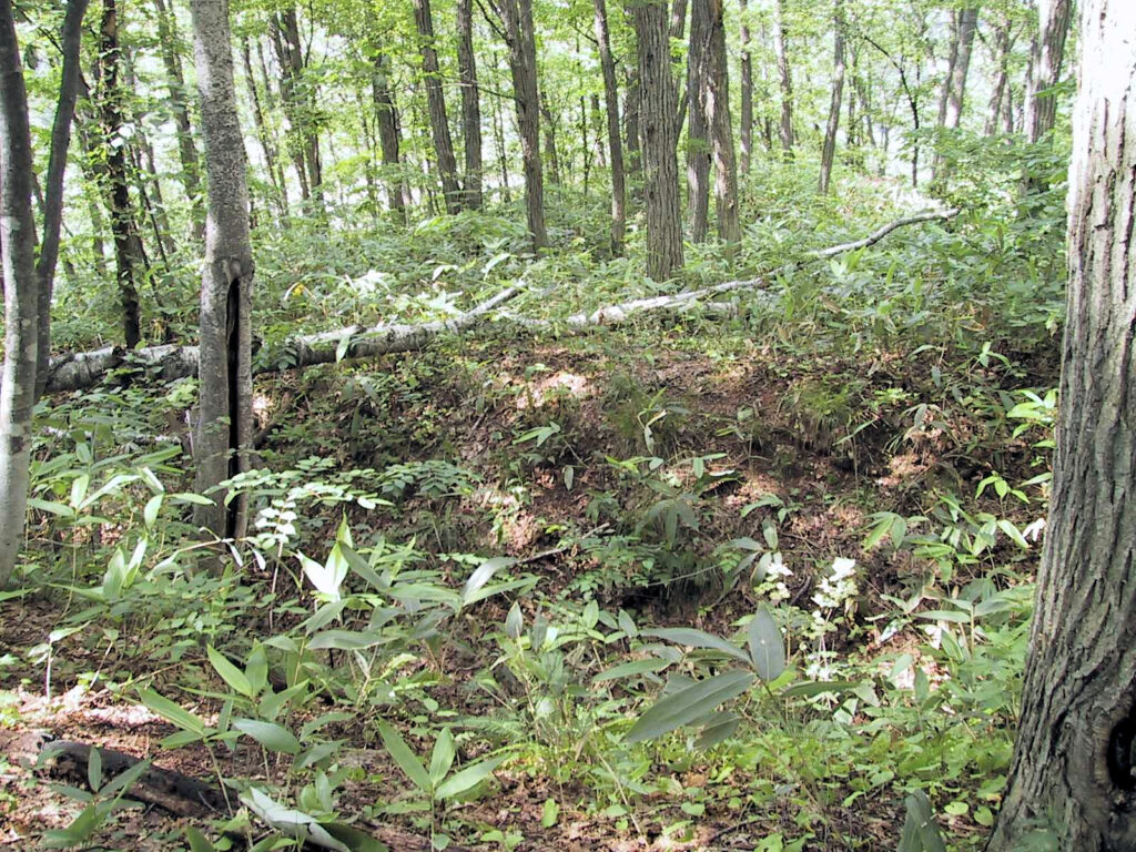 立岩山チャシは丁度大学校舎の北側の裏手にあたり、石狩川に向かって突きだした台地上にありますが、その西側に半円状の壕がありました。幅は2mほど、深さは1.5m~2mぐらいはあるV字状の壕です。ちょっと草をかき分けて行かなくてはいけませんでしたので、写真に撮るとよくわからないのですが、なかなか保存状態は良好です。