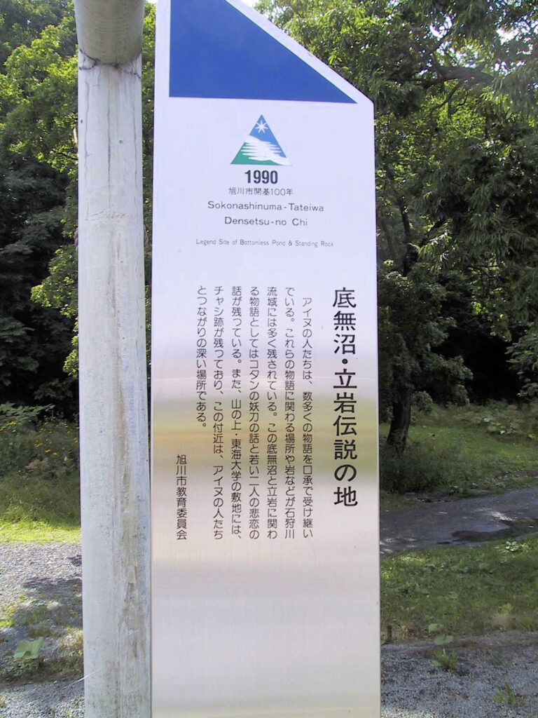 このチャシのある台地北側に石狩川との間に立岩が数個あり、アイヌ伝説の立岩と一致することから「立岩チャシ」と呼ばれています。別称の「アサムサクトー」とは底なし沼の意味で、「底無沼の妖刀」「悲恋の底無沼」という伝説が残っているそうです。