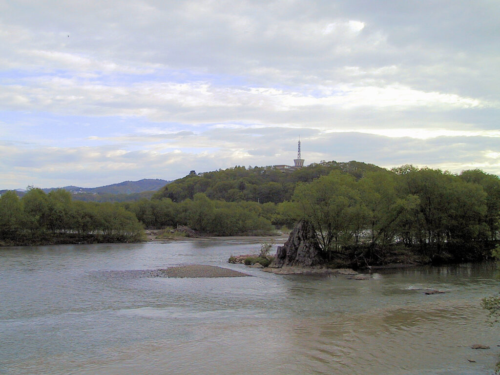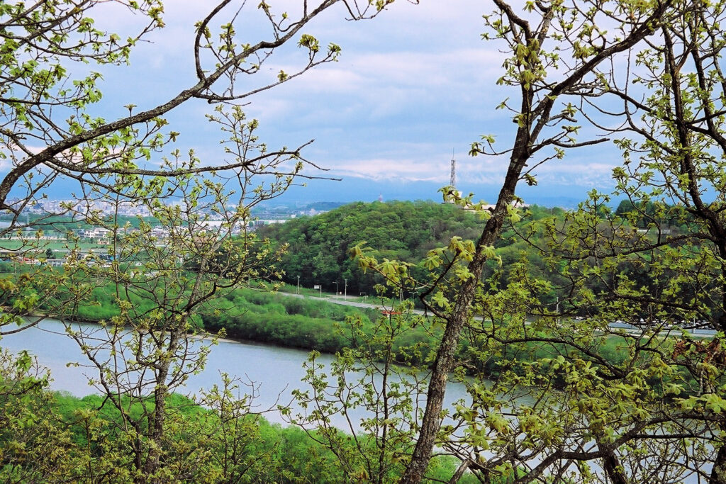 この日はお城めぐりMLの菅原さんと深川・旭川周辺のチャシ巡りをしました。この時は神居古潭チャシには行きませんでしたが、神居岩チャシの頂上の展望台から神居古潭チャシと神居古潭竪穴住居遺跡のある辺りが一望できましたの写真を撮りました。石狩川に沿ったところにあるというのがよくわかりました。(2002/5/12)