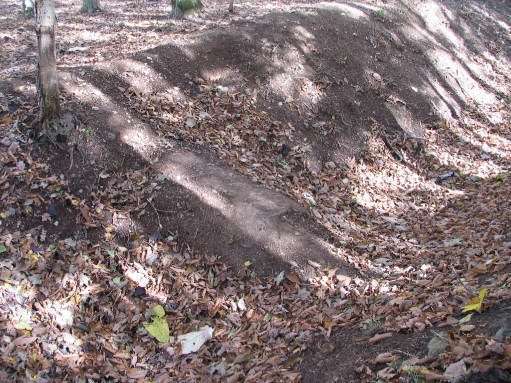きれいな半円状の壕で、その内側には掘った土を盛り上げたと思われる土塁もありました。壕の端の方には土橋状のものがありましたのでルイカ構造かと思いましたが、8月の見学会に参加した菅原さんの話によると、空堀に倒木があり,そこに堆積した土の可能性が高いという説明があったそうです。確かに位置的に中央ではないので変だなと思いましたが、納得しました。