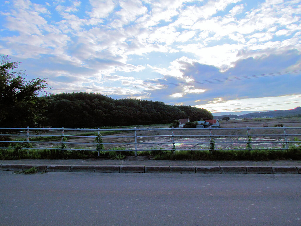 上名寄チャシはチノミチャシから東に少し進んだところにあり、名寄市と下川町の境界線付近に位置します。丁度「下川町」という石のモニュメントが道路脇左手にあり、そこから見える河川敷がチャシのようです。日暮れが近づいていましたし、じっくり探索する時間もなかったので、無理せず遠景を写真におさめて帰路につきました。(たぶん写真2か3の奥の手前の方に見える林の辺りだと思うのですが…)