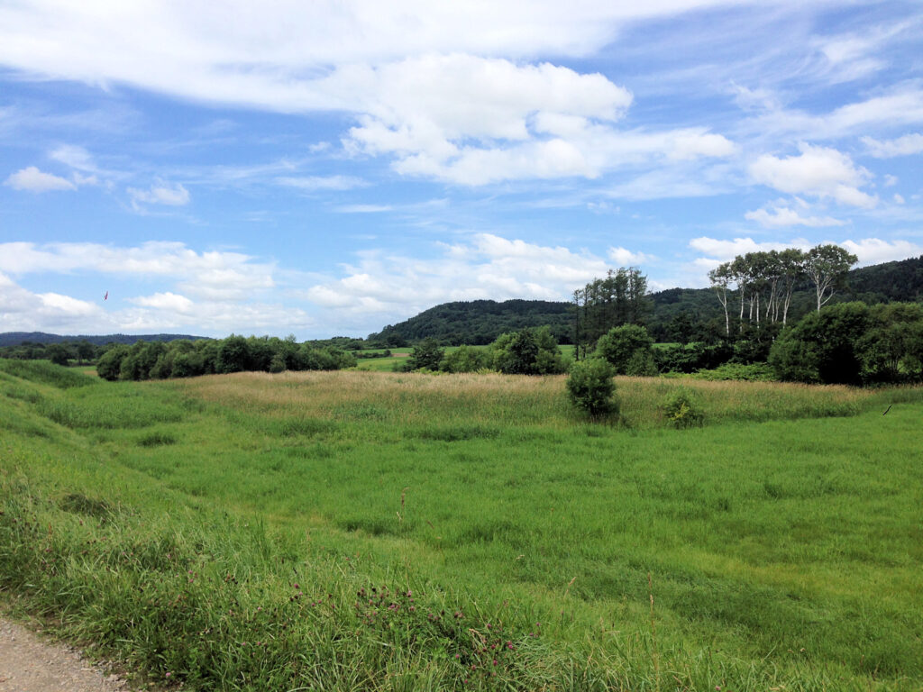 道北旅行の初日、北竜のひまわりの里や小平ダム道の駅富士見を回ったあと、天塩川口チャシへ。一応、地図ですぐ近くの地点に着きましたが、草むらしか見えず、遠景写真を撮ったのみです。『道北のチャシ』に載っている平面図によると、トーウツナイ川の右岸、川に向かって伸びる舌状台地を横切るように弧状の壕が1条あるようです。