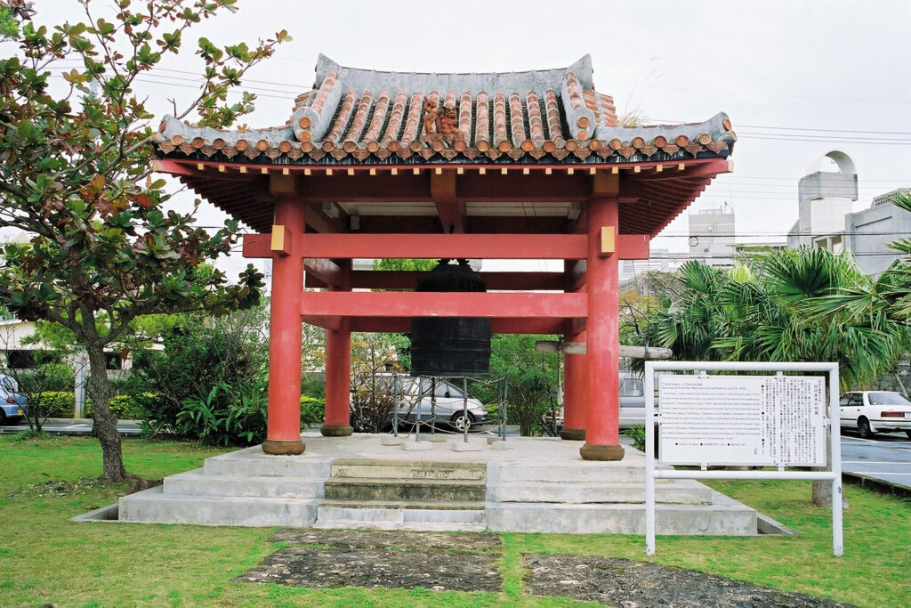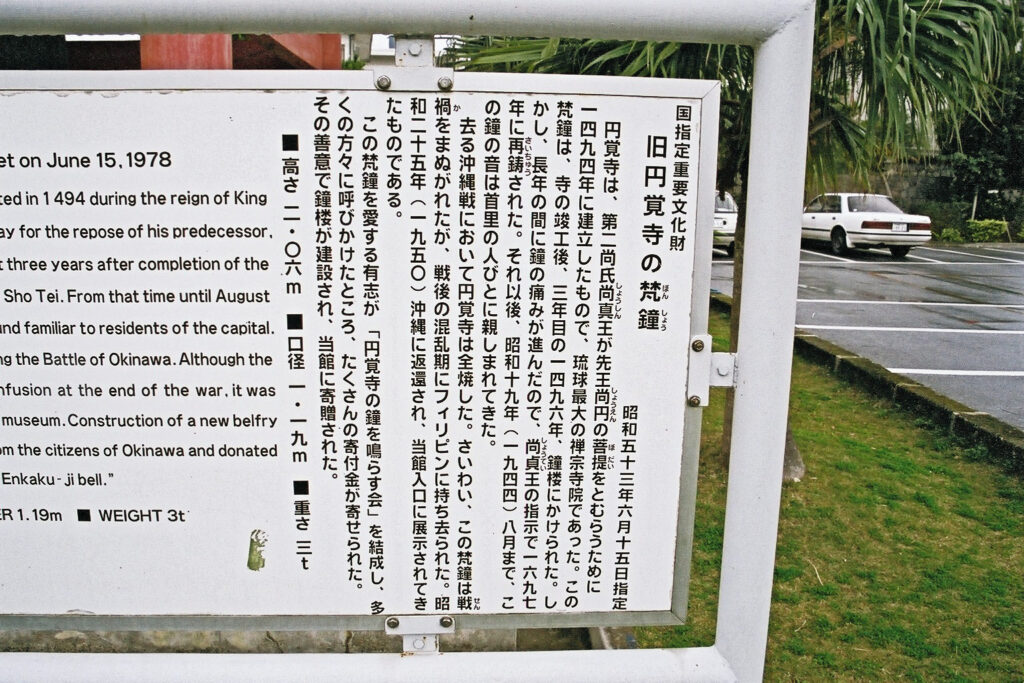 実は今回この円覚寺には行っていないのですが、県立博物館の前庭に旧円覚寺の梵鐘が置かれていたので、それをご紹介します。その説明板によると、円覚寺は第二尚氏の尚真王が父・尚円王の菩提を弔うために1494年に建立したもので、琉球最大の禅宗寺院でした。この梵鐘は1496年に鐘楼に掛けられ、1697年には尚貞王の指示で再鋳され、1944年までその鐘の音は首里の人々に親しまれていました。しかし沖縄戦で円覚寺は全焼し、この梵鐘も戦禍は免れたものの、戦後の混乱でフィリピンに持ち去られ、1950年に返還され、県立博物館入口に展示されていました。その後有志で「円覚寺の鐘を鳴らす会」が結成され、鐘楼が建設され現在位置に梵鐘が甦ることになったとのことです。