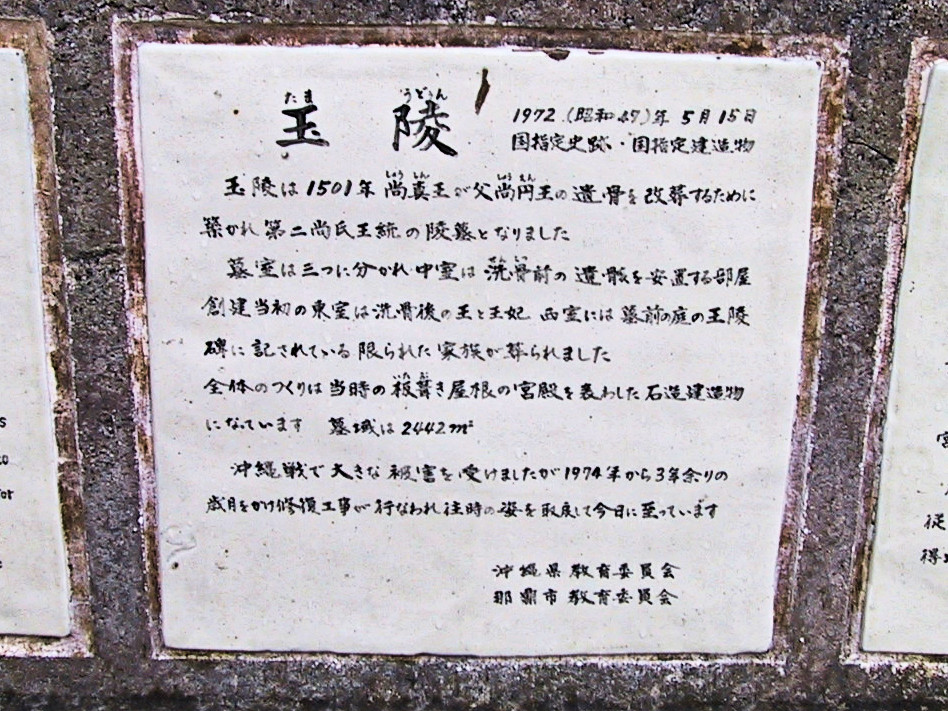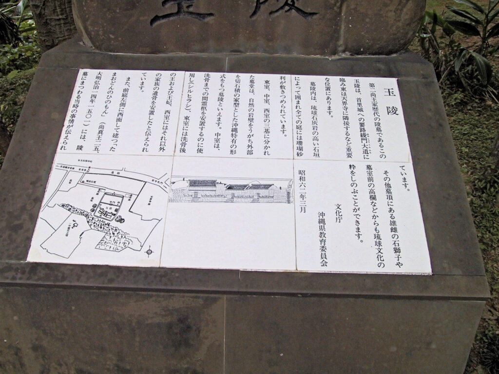 玉陵は第二尚氏王統歴代の陵墓で、沖縄最大の規模を持つ破風墓で、すべて石造りの荘厳なものです。3室に別れており、中室は洗骨まで遺骸を入れる墓、左側の東室は洗骨後の王の遺骨を納める墓、右側の西室は洗骨後の王族の遺骨を納める墓となっています。玉陵の造営は第二尚氏第三代国王尚真王が父王尚円の遺骨を改葬するため1501年創建したのに始まり、以後歴代王家の人々をここに葬ることになっていました。
