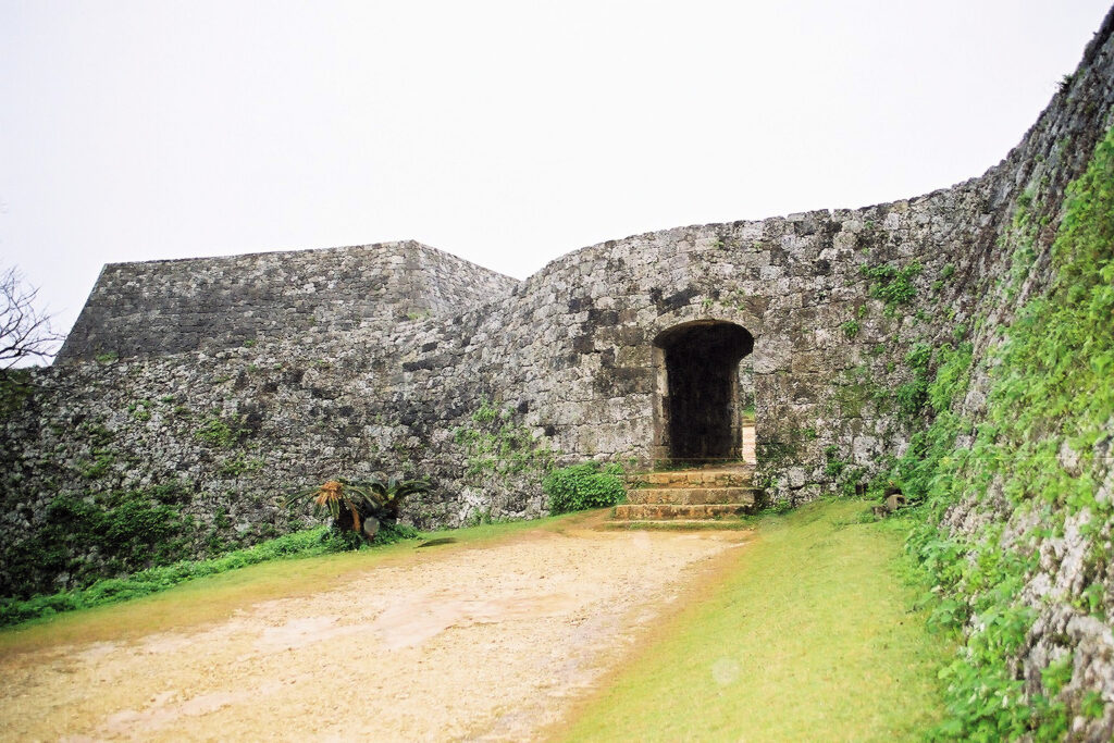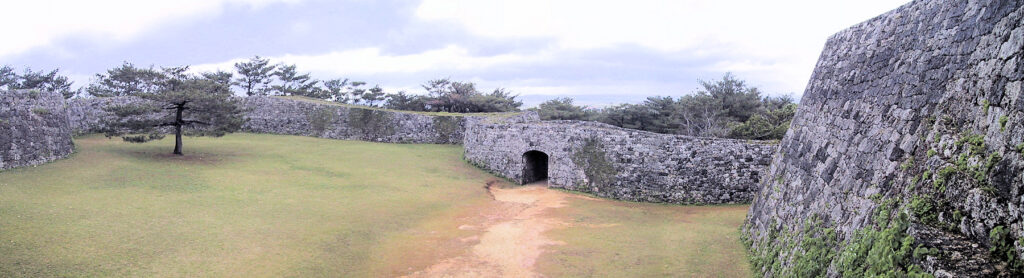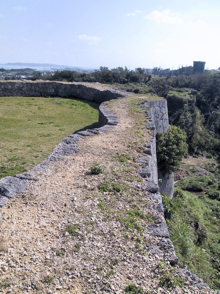今回の旅行で首里城をのぞくとこの中城城が一番印象に残りました。坂を上り広い馬場に達すると、まずは三の郭の屈曲した石垣とその横にあるアーチ形の裏門がまず目に入ります。裏門をくぐると北の郭ですが、ここはブルーシートがかかり修復中のようです。その左に三の郭への門がありますが、この石垣も迫力があります。三の郭に入ると先ほどと同じように屈曲した二の郭の石垣が見えます。再び北の郭に戻り、次は二の郭、そして一の郭に行きますが、カーブした石垣・アーチ形の門と感嘆しながら眺めます。一の郭の外・南の郭には拝所があり、そこを出たのが正門です。アーチ形ではありませんから、櫓門形式だったのでしょう。ここの両側に広がる石垣も迫力です。
