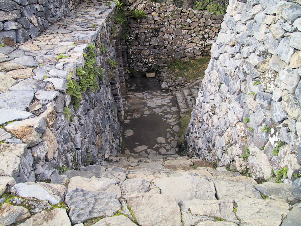 二の郭の拱門の前まで来ると、その左手前から下に降りる道を嫁さんがみつけ、その近くに古い石垣を見つけました。あれはもともとの古い石垣なんでしょうかねえ?