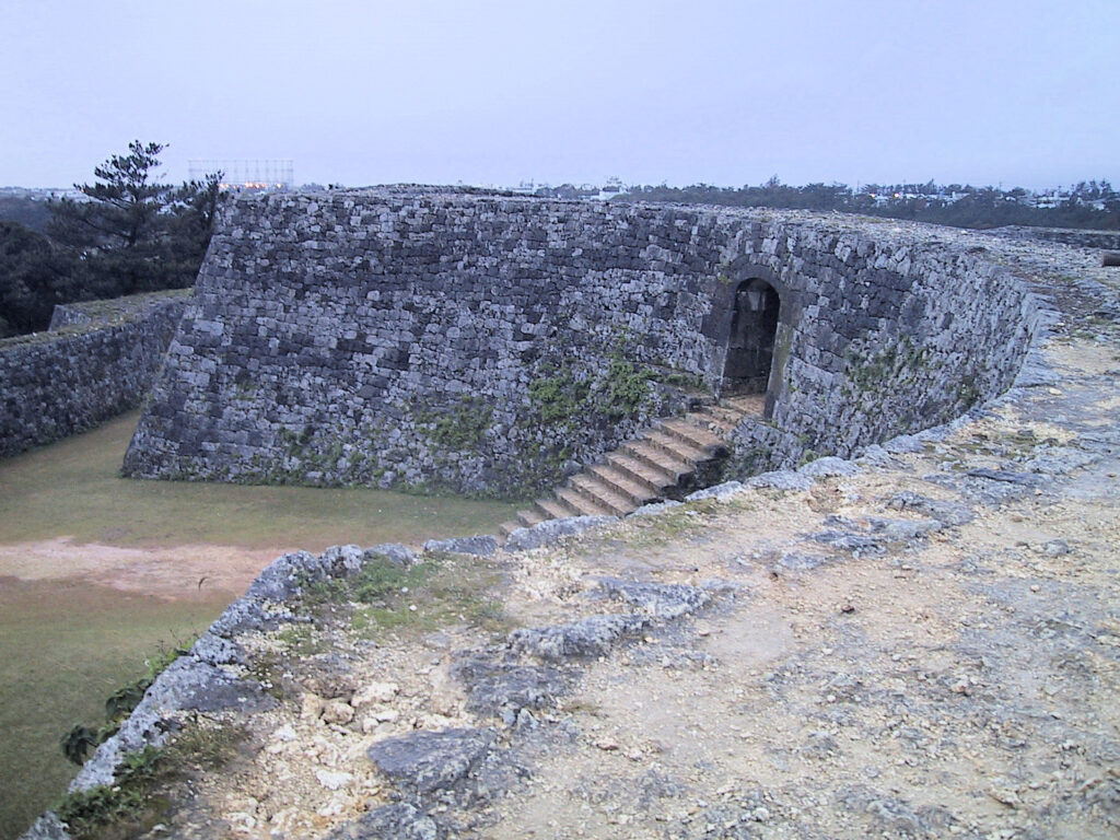 今回の沖縄旅行は、この座喜味城からスタートしました。2時半頃に那覇空港に着き、レンタカーを借り高速を走りながら座喜味城に着いたのがもう夕方の5時半近くでした。この日は天気予報通り、小雨が降るちょっといやな天気でしたが、座喜味城に着くと遅い時間にもかかわらず観光バスなどが出入りしていました。近くにある資料館は当然もう閉まっていましたので、早速石段を登り城跡へと進みました。