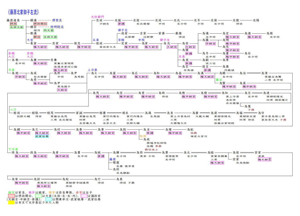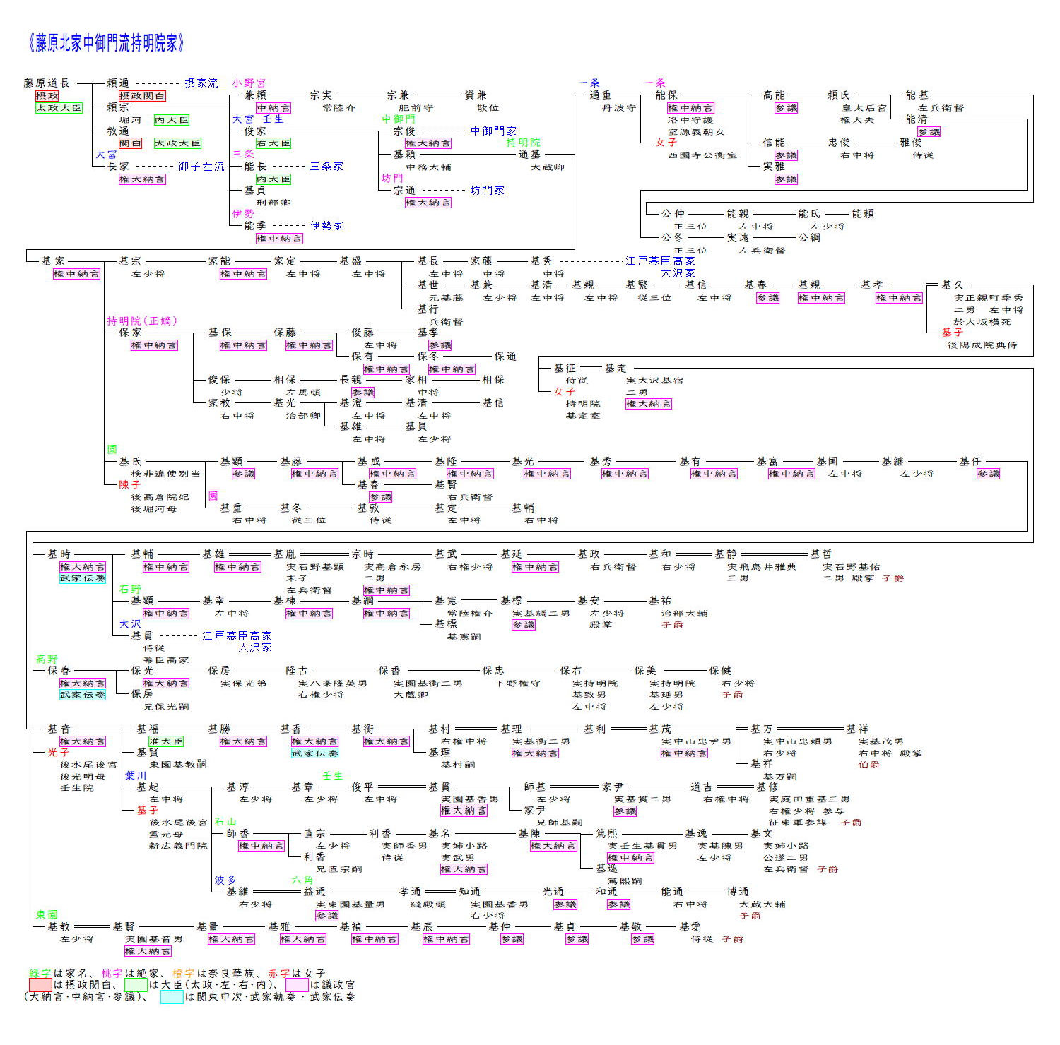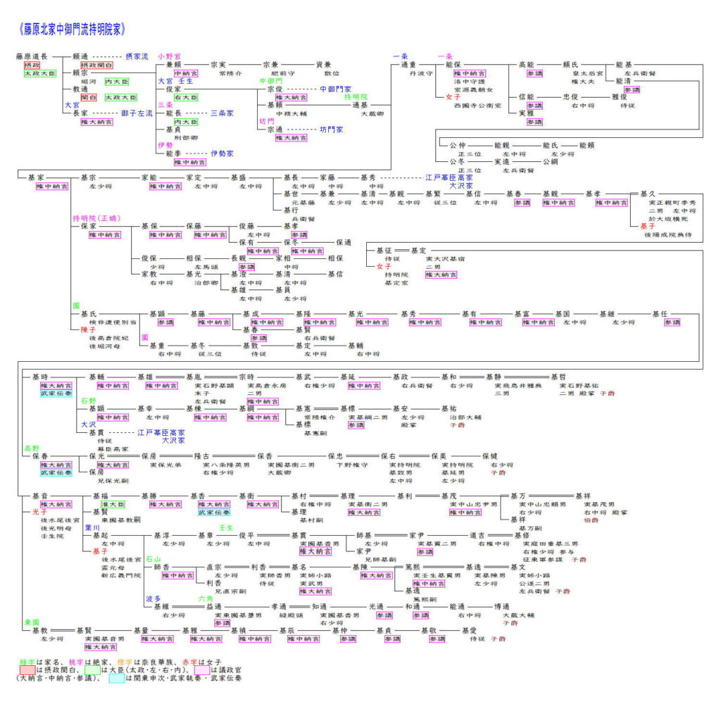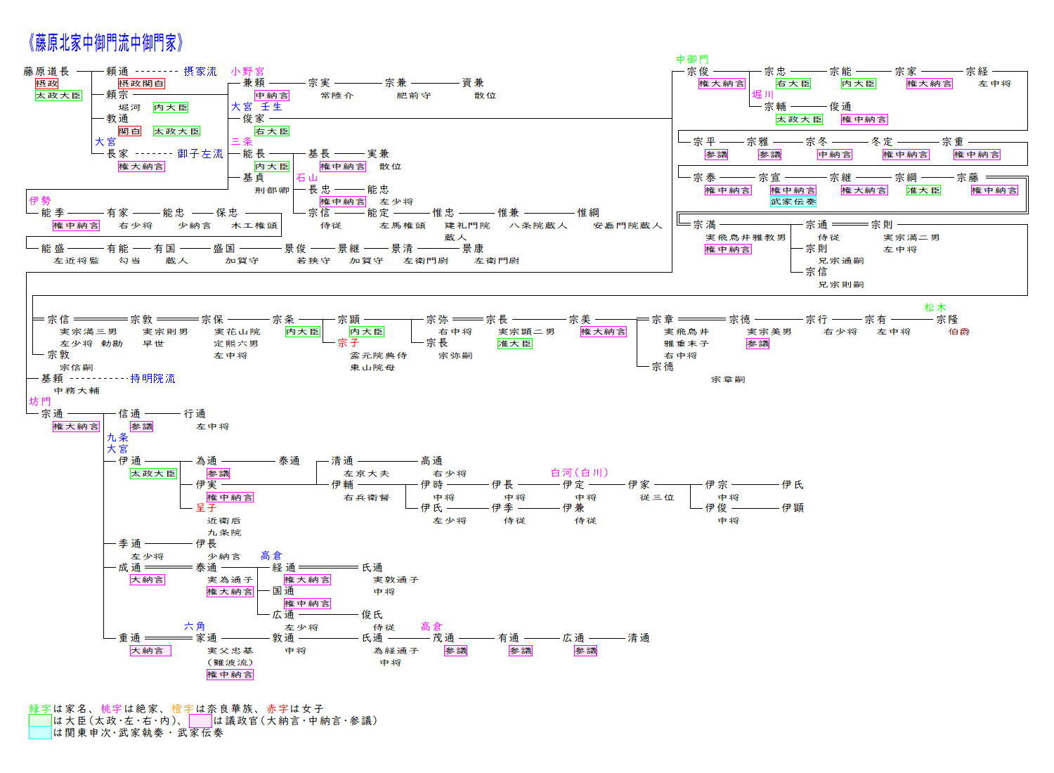俊家の子からは、長男宗俊・四男基頼・五男宗通の系が続き、基頼の子孫から一条・持明院・園の諸家が分流しました。宗通は坊門と号して権大納言に昇り、白河院別当となり近臣として権勢を振るいました。(中関白道隆流にも坊門家があるが別流) この子孫は五流に別れ九条・坊門・高倉・白河家を出しますが、いずれも南北朝期までに絶家となりました。宗通の次男伊通(これみち)は天皇の心得を説いた意見書である『大槐秘抄(たいかいひしょう)』1の著者としても知られ、太政大臣にまで昇りました。伊通の娘呈子は摂関家の忠通の養女として入内し近衛天皇の中宮となりました。
