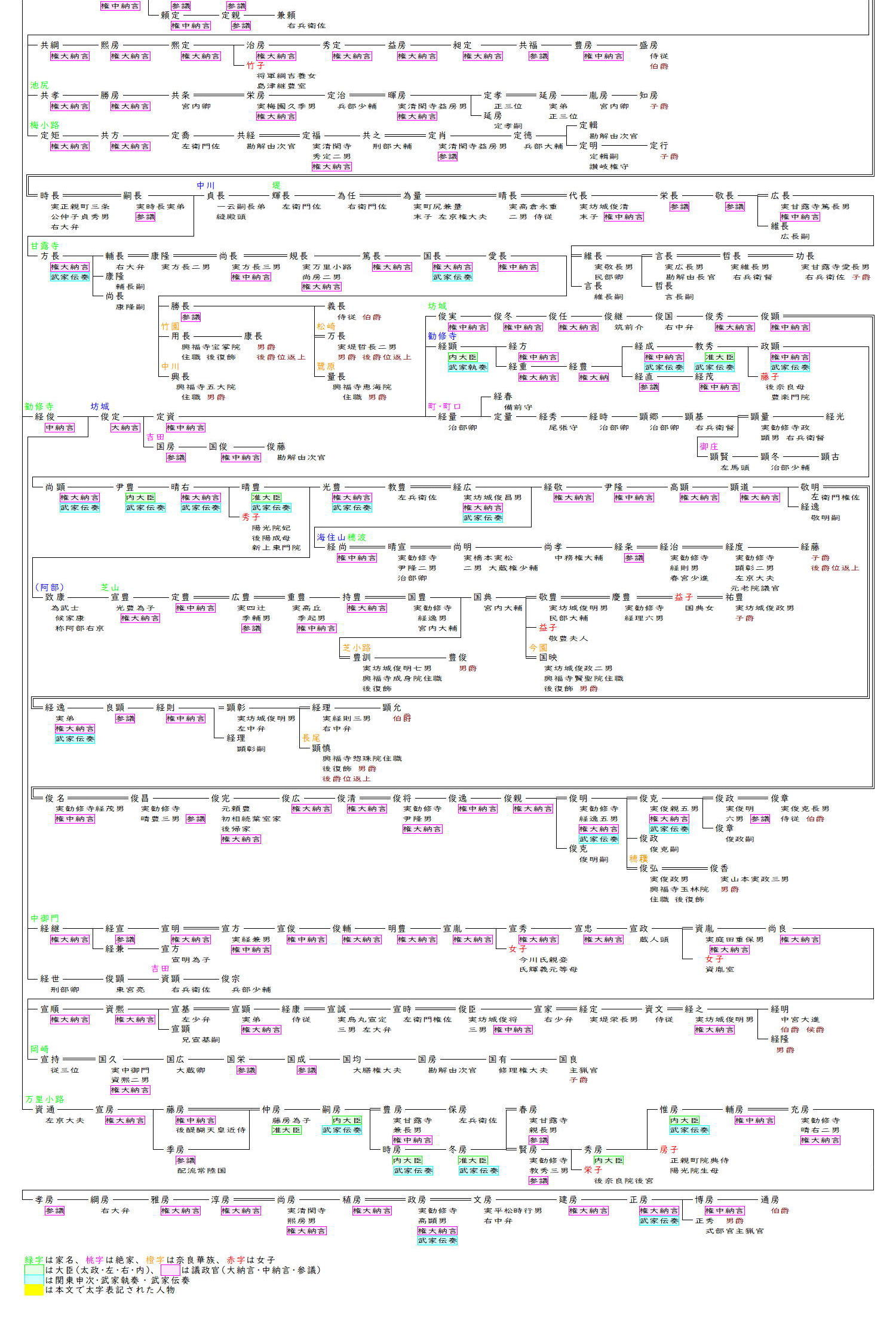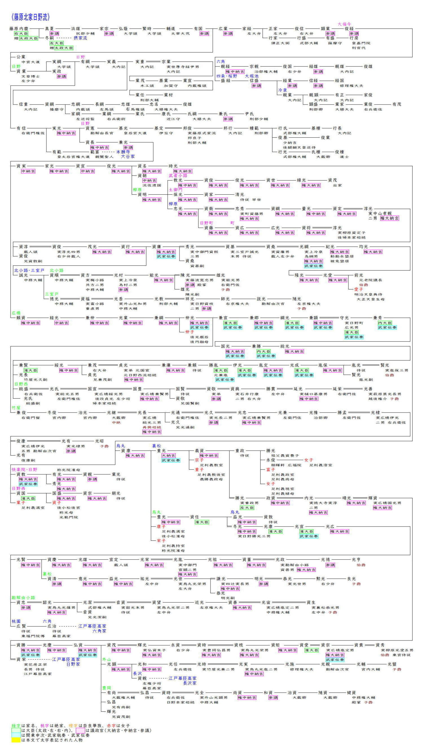 最後に坊城参議為房の次男顕隆を祖とする葉室家です。顕隆は父為房より家嫡とされ兄為隆より官位昇進が早く権中納言まで昇りました。顕隆は白河法皇の近臣として信任を得、「夜の関白」と称されるほどの権勢を誇りました。しかし顕隆の死後は勧修寺家伝来の所領や家伝の文書類を多く伝領した為隆の流れが嫡流となっていきました。顕隆の孫光頼は平氏政権樹立に尽力し、光頼には光雅・宗頼の二子がいましたが、光雅の系統は南北朝時代頃に断絶し、宗頼流は頼親が伏見院政の執権を勤め、光忠は将軍足利義材に寵用されるも、明応の政変で殺害されました。その曾孫定藤が天正8年(1580)に没すると養子相続が続きましたが、教忠・頼孝・頼要は従一位に昇り、頼胤は准大臣に昇り武家伝奏に補されました。