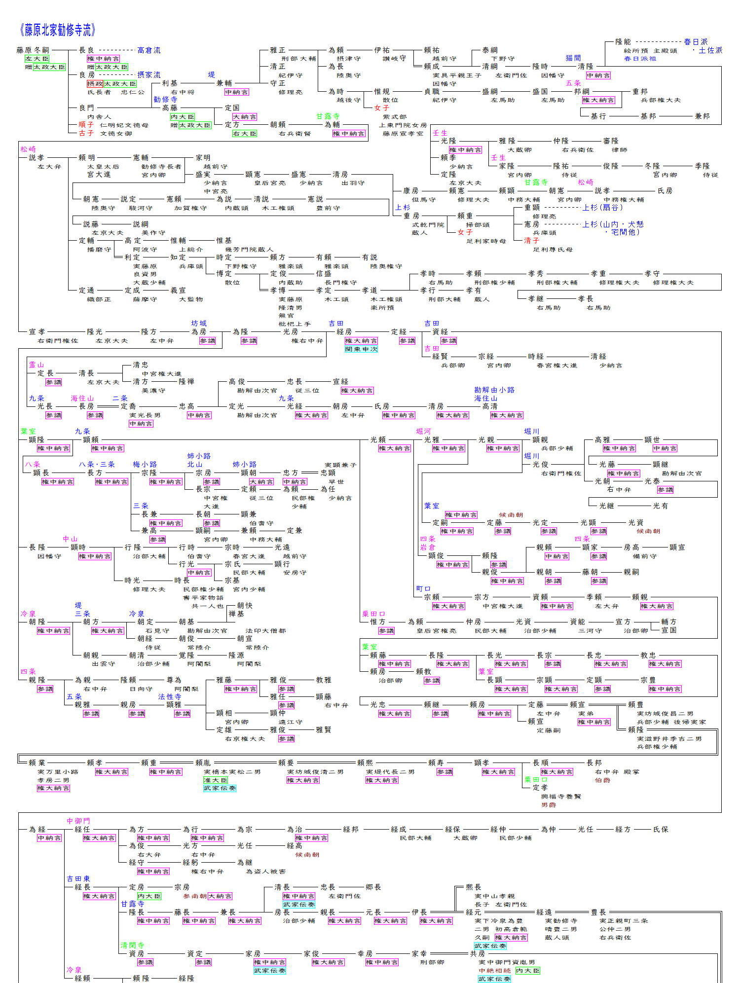 勧修寺(かじゅうじ)流は藤原冬嗣の六男良門の次男高藤を祖とします。高藤の娘胤子が入内し宇多天皇の女御となり醍醐天皇の生母となったことからこの系の繁栄は始まりました。勧修寺の称号も醍醐天皇が母后の追善のため胤子の兄弟である定方に命じて創建させ、のち勧修寺流の氏寺となった山科勧修寺8に由来しています。高藤は内大臣、その子定方は右大臣に昇りましたが、以後しばらく振るわず、為房が白河院の側近として仕え摂関家の家司も努め家勢を回復しました。ちなみに定方の曾孫宣孝は紫式部(高藤の兄弟利基の子孫)の夫として知られており、二人の娘は歌人として知られる大弐三位賢子です。為房の後は数流に別れましたが、為隆流・顕隆流以外は鎌倉時代までに中絶し、為隆の子孫は勧修寺流の嫡流となり、顕隆の子孫は葉室と称しました。