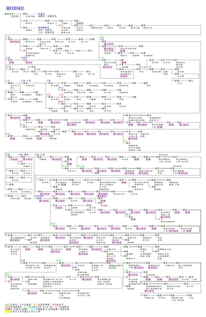 兼通の長男顕光は無能な人物として知られ、道長におもねって左大臣まで昇進しましたが、娘元子を一条天皇の女御として入内させましたが子ができず外戚となることはなく。もう一人の娘延子も三条天皇の東宮敦明親王に嫁ぎ皇子を生んでいましたが、後ろ盾のいない敦明親王は東宮を辞退し、道長の娘寛子と結婚し延子のもとを去ってしまったので、延子は絶望してほどなく病死したため、顕光は道長を呪詛させ、その数年後没しました。顕光の死後、寛子をはじめ道長の娘が三人も亡くなったため顕光と延子の祟りではないかと恐れられました。顕光の長男重家は左少将まで昇進しましたが、世をはかなんで出家遁世し、その後数代で断絶しました。また徳川氏の重臣本多氏は顕光の子顕忠の子孫と称していますが、実際は不詳です。