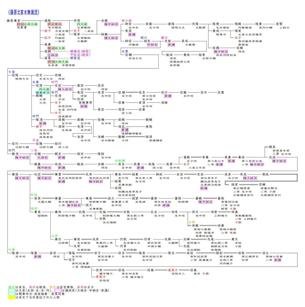 水無瀬流は藤原道長の兄の中関白道隆を始祖とします。道隆は父兼家の後を襲って摂関となり、娘定子を一条天皇の中宮とし嫡男伊周を内大臣としましたが5年後に急死し、その後叔父道長との権力闘争に敗れた伊周と弟の隆家が左遷されると、道隆流は不遇の時代を迎えます。伊周の流れは数代で断絶、隆家の子孫が続き、隆家の曾孫経忠は妻実子が鳥羽天皇の乳母だったので、白河・鳥羽院の近臣として仕えました。経忠の子信隆は坊門と号し、その娘殖子(七条院)が高倉天皇の妃となり、後鳥羽院・後高倉院の生母となったので、弟信清は内大臣まで昇り、隆清も参議に昇りました。