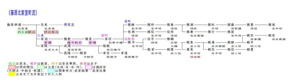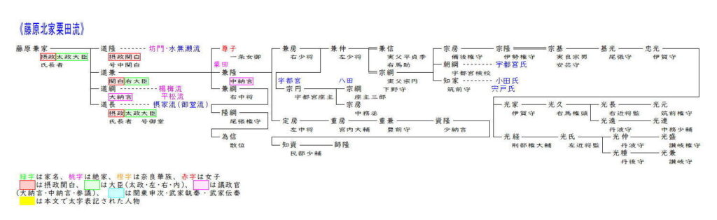 楊梅流は藤原道隆・道兼・道長の異父兄弟道綱を祖とします。道綱は正妻腹の三人と比べ昇進は大きく遅れましたが、異母弟の道長とは親しかったので、道長が権勢を得ると大納言まで昇進しました。また道綱の母は女流日記の先駆けといわれる『蜻蛉(かげろう)日記』4を綴り、和歌も多く残すなど平安時代の女流作家として知られています。道綱の三男兼経は母方の叔母源倫子が道長の正妻であったため道長の養子となり、道長の威光を背景に昇進を重ね正三位参議まで昇りました。その後しばらくは四位止まりでしたが、兼経の曾孫季行は従三位に叙されて公卿に列し、娘兼子が九条兼実の室となり摂関家とも良好な関係を結びました。季行の後は二男定能の系が嫡流で樋口(二条)を称しました。定能は後白河院の近臣となり楊梅流では最も高い権大納言まで達しました。三男資家は従三位非参議までしか昇進できませんでしたが、その子資家は権大納言まで昇り、その子孫は度々議政官を出しました。資継からは平松を称しましたが、戦国期の永禄頃に断絶しました。