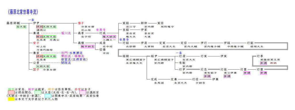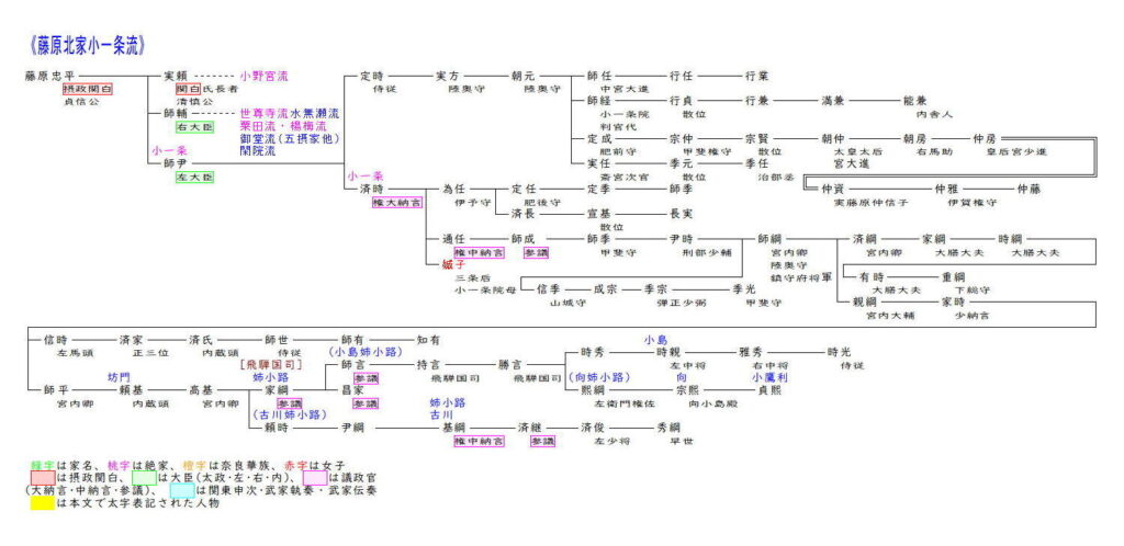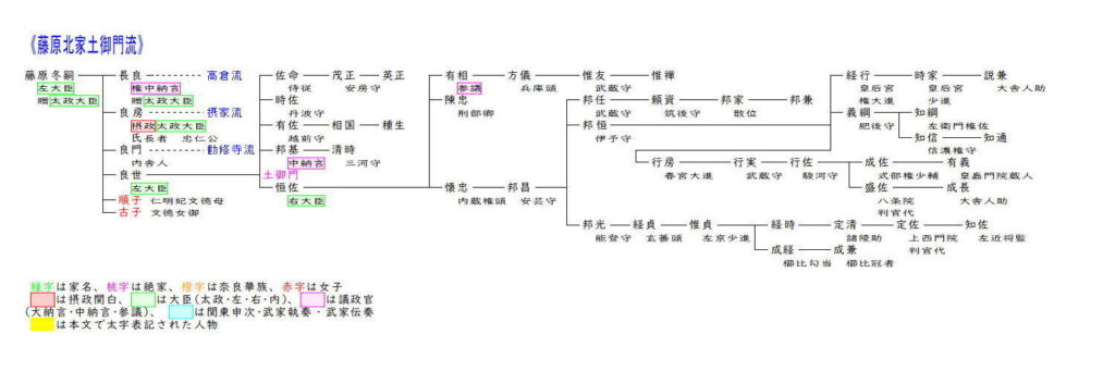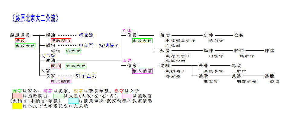 大二条流は藤原道長の五男教通から始まります。教通は五男でしたが兄頼通と同じく嫡子として扱われ、庶兄頼宗を越えて急速な昇進を果たし、26歳で内大臣に昇任します。その後は娘を後朱雀天皇・後冷泉天皇に入内させるも皇子女には恵まれず、兄頼通に従順に仕えることで兄の隠退後70を過ぎてやっと関白に任ぜられました。その後は兄頼通の子師実に摂関を譲るという約束に反して実子信長への関白譲渡を図ったことから兄弟の不仲が深刻となり、摂関家の衰退を招いてしまいました。