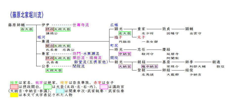 堀川流は藤原師輔の二男で関白太政大臣を務めた兼通を祖とします。兼通は弟の兼家と昇進を争いそれが元で不和となっており、兄の摂政伊尹の後任を巡って口論となるほどであり、円融天皇の後見として兼通が関白となると兼家の昇進を全く止めてしまいました。しかしその3年後兼通が亡くなると兼家が権力を握ると、公卿となっていた兼通の子顕光・時光・朝光等の昇進は滞り、兼家の子らに次々と追い抜かれていきました。