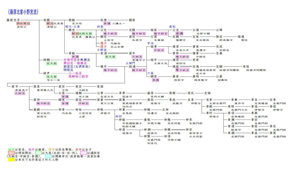 実頼の三男斉敏は参議止まりで、その三男懐平(かねひら)は三条天皇の側近として権中納言まで昇進しました。懐平の二男資平は伯父実資の養子となって小野宮流の嫡流を継いでいたため大納言まで昇り、曾孫の資信の代まで議政官を努めましたが、以後は次第に衰退していきました。