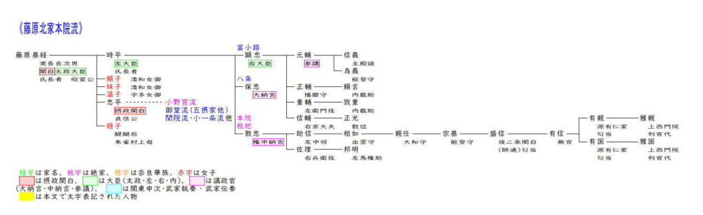本院流は藤原基経の長男時平を祖としています。時平は父基経が死去した際にはまだ21歳で、摂関は置かれず宇多天皇の親政となりました。宇多天皇が醍醐天皇に譲位した際には時平と菅原道真に政務を委ね、時平が左大臣、道真が右大臣となりました。しかし昌泰4年(901)道真は太宰府に左遷となり、時平は以後治改革に意欲的に取り組みましたが、延喜9年(909)に39歳で死去し、以後弟忠平の子孫が朝廷の中心となっていきました。