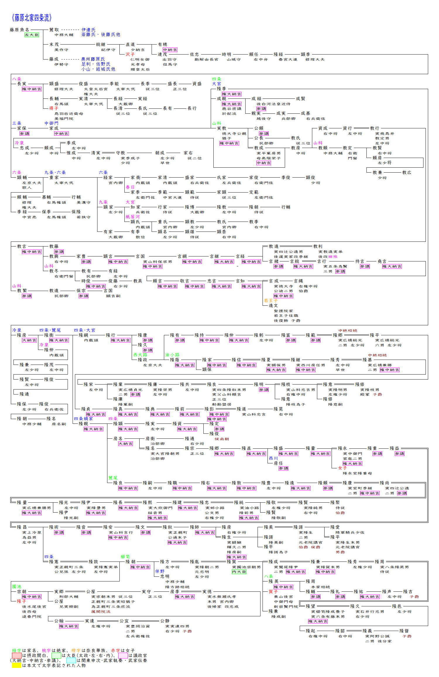 四条流は藤原北家の祖房前の五男左大臣魚名を祖とします。魚名は兄永手の死後左大臣に昇り北家の中心となりましたが、翌年に突然太宰府に左遷となり失脚しました。魚名の子のうち鷲取の子孫からは四条流庖丁式1の創始者といわれる山蔭や藤原道隆・道兼・道長・詮子らの母時姫(山蔭の孫、藤原兼家室)、伊達氏の祖の朝宗、斎藤氏・後藤氏・加藤氏・遠山氏等の祖といわれる利仁(山蔭の甥、鎮守府将軍)等が出ています。