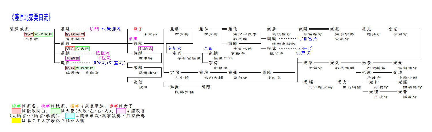 水無瀬流は藤原道長の兄の中関白道隆を始祖とします。道隆は父兼家の後を襲って摂関となり、娘定子を一条天皇の中宮とし嫡男伊周を内大臣としましたが5年後に急死し、その後叔父道長との権力闘争に敗れた伊周と弟の隆家が左遷されると、道隆流は不遇の時代を迎えます。伊周の流れは数代で断絶、隆家の子孫が続き、隆家の曾孫経忠は妻実子が鳥羽天皇の乳母だったので、白河・鳥羽院の近臣として仕えました。経忠の子信隆は坊門と号し、その娘殖子(七条院)が高倉天皇の妃となり、後鳥羽院・後高倉院の生母となったので、弟信清は内大臣まで昇り、隆清も参議に昇りました。