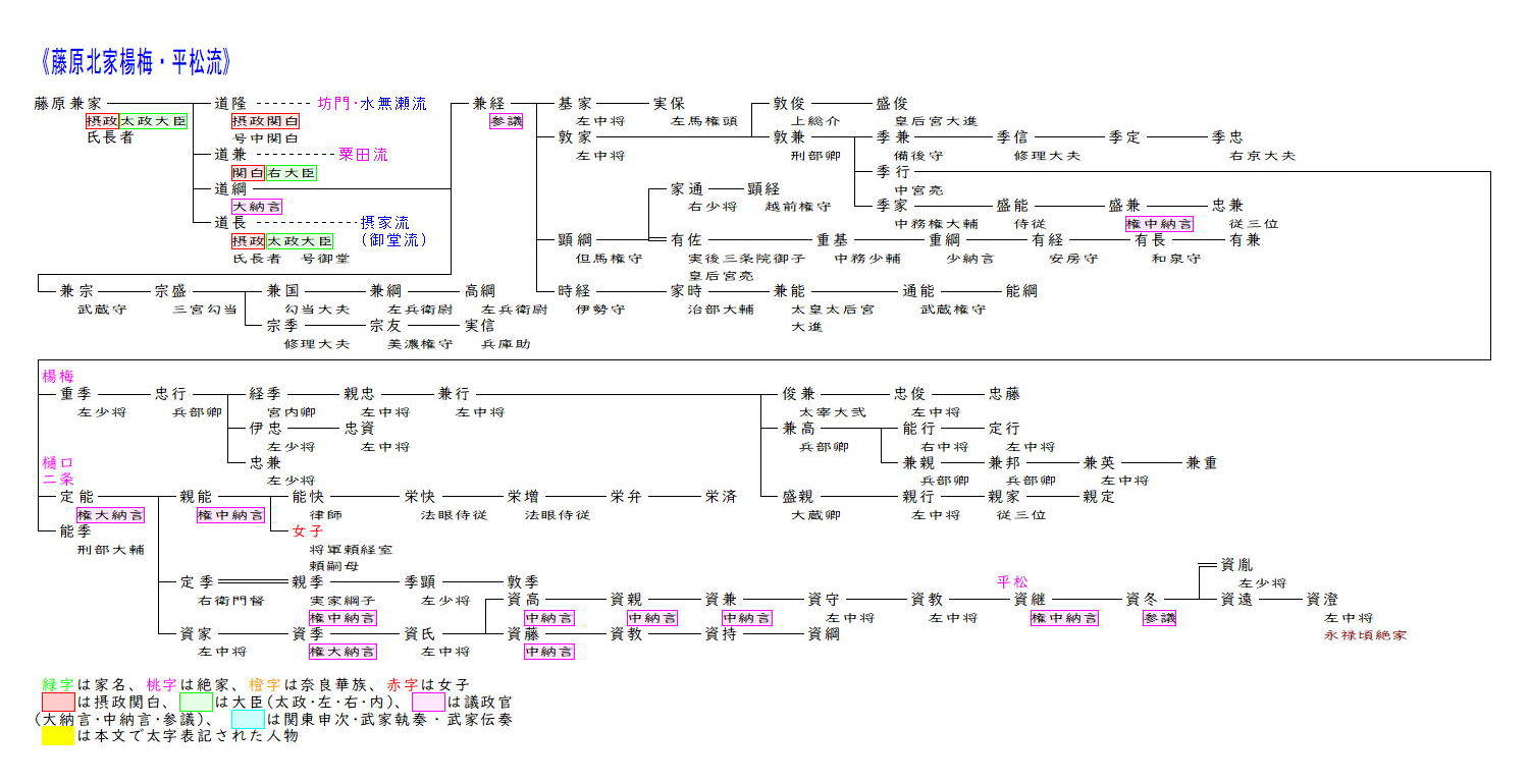 楊梅流は藤原道隆・道兼・道長の異父兄弟道綱を祖とします。道綱は正妻腹の三人と比べ昇進は大きく遅れましたが、異母弟の道長とは親しかったので、道長が権勢を得ると大納言まで昇進しました。また道綱の母は女流日記の先駆けといわれる『蜻蛉(かげろう)日記』4を綴り、和歌も多く残すなど平安時代の女流作家として知られています。道綱の三男兼経は母方の叔母源倫子が道長の正妻であったため道長の養子となり、道長の威光を背景に昇進を重ね正三位参議まで昇りました。その後しばらくは四位止まりでしたが、兼経の曾孫季行は従三位に叙されて公卿に列し、娘兼子が九条兼実の室となり摂関家とも良好な関係を結びました。季行の後は二男定能の系が嫡流で樋口(二条)を称しました。定能は後白河院の近臣となり楊梅流では最も高い権大納言まで達しました。三男資家は従三位非参議までしか昇進できませんでしたが、その子資家は権大納言まで昇り、その子孫は度々議政官を出しました。資継からは平松を称しましたが、戦国期の永禄頃に断絶しました。