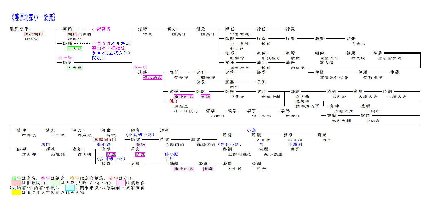 小一条流は藤原忠平の五男で左大臣に昇った師尹に始まります。師尹は兄の実頼・師輔を補佐し、権中納言まで順調に昇進しました。また娘芳子は村上天皇の後宮に入って女御となり、寵愛深く二人の皇子を生みましたが、病弱であったため東宮にはなれませんでした。左大臣源高明が安和の変で失脚すると左大臣に昇りましたが、その半年後に没し、世間では源高明の怨みによるものと噂されました。
