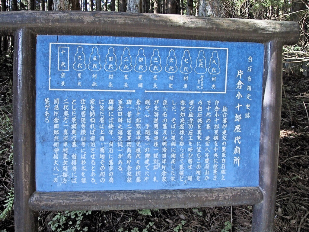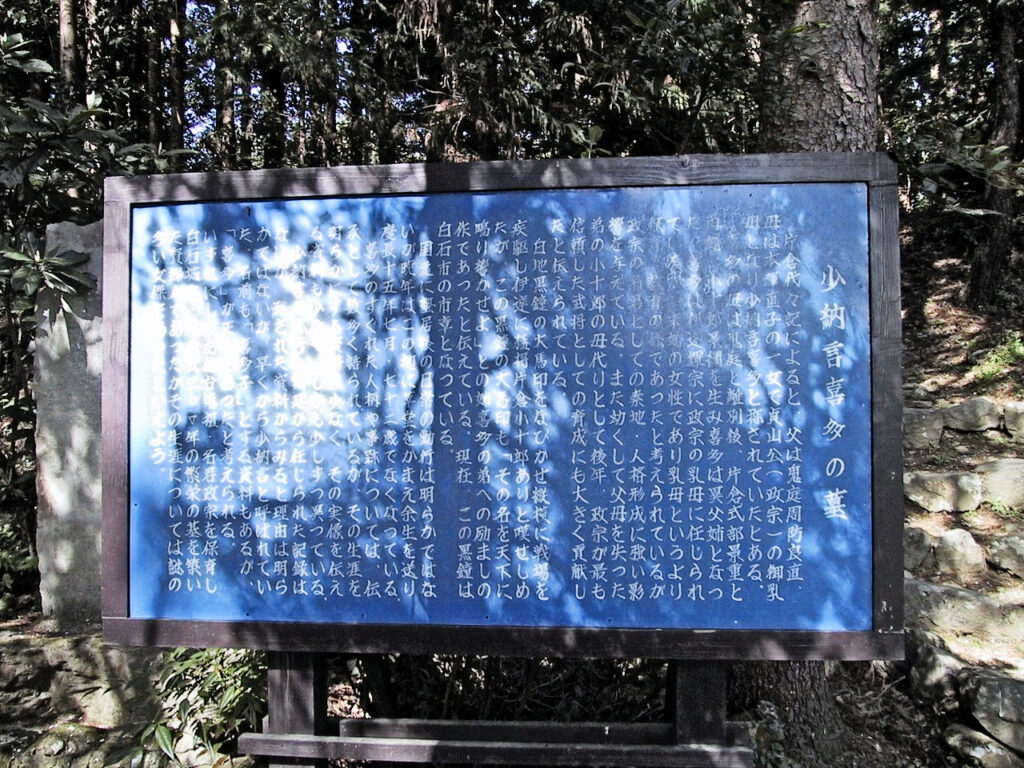 またそこからさらに国道を西に進んだところには片倉小十郎景綱の異父姉・片倉喜多の墓所があります。喜多は鬼庭左月良直の娘として生まれましたが、母が父と離別し片倉景重と再婚し景綱を生んだため片倉家で育てられました。のちに伊達政宗の乳母となって少納言と名乗りましたが、未婚の女性でしたので乳母というよりは教育係のようなものだったと考えられ、政宗の人格形成に強い影響を与えています。