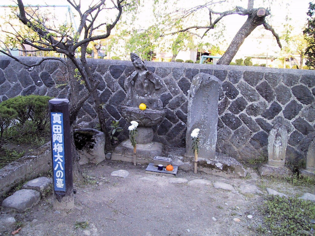 二人の墓は仲良く並んでおり、大八の墓には六連銭ならぬ一文銭が刻んでありました。また、阿梅の墓は写真を見ればわかるように、何か人の形をしておりました。