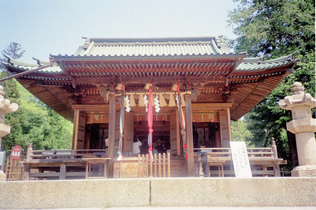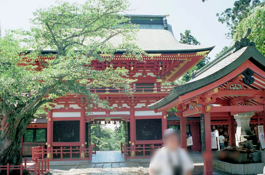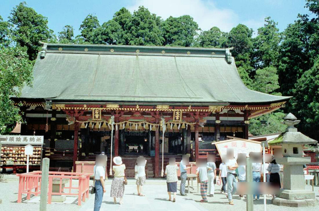 37基の石灯籠が両側に並ぶ石段を登ると随身門がありますが、楼門形式で左右に本多忠勝・藤堂高虎の随身像が置かれています。その先には拝殿がありますが、これは昭和10年(1935)年の失火で炎上したため、昭和39年(1964)に復元されたものです。