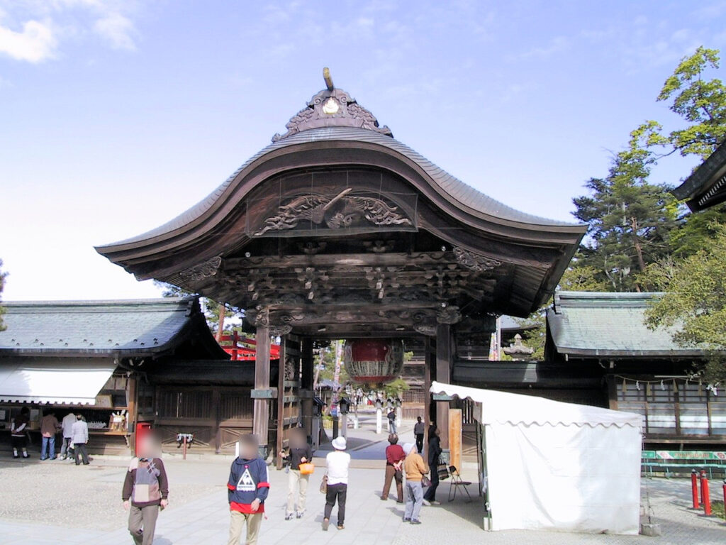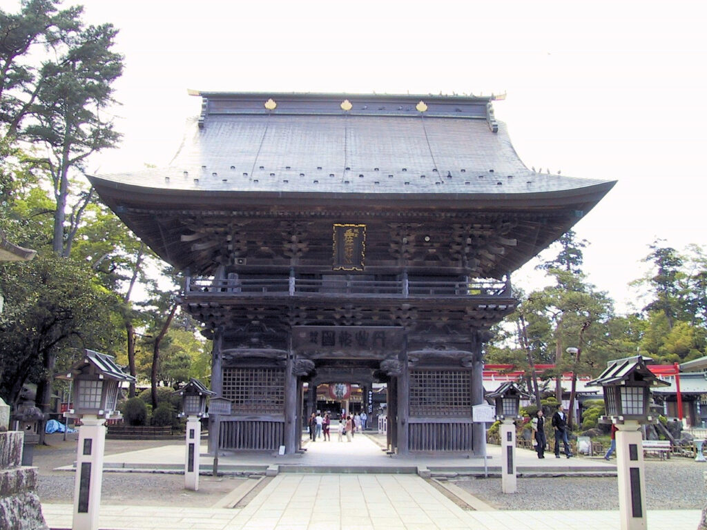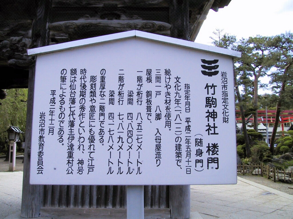 竹駒神社は陸奥の国守であった小野篁が山城国紀伊郡伊奈利山の稲荷明神を勧請したものと伝えられています。朱塗りの鳥居をくぐっていくと、まず文化9年(1812)造営の重層銅板葺入母屋造の随身門が見えてきます。これをくぐると次に天保13年(1842)造営の向唐門があり、その奥に社殿があります。この社殿は五代藩主伊達吉村の造営でしたが、平成2年(1990)放火により焼失し、現在のものは平成6年(1994)に再建されたものです。
