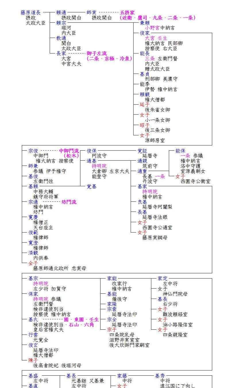 大沢家は諸史料で初めて高家を努めた家として知られていますが、その出自は藤原北家に遡ります。藤原北家の最盛期を築いた藤原道長には多くの子がいましたが、その次男頼宗が大沢家の遠祖となります。頼宗の母源明子(源高明[醍醐源氏]の娘)は道長の嫡妻ではなく、当時現職大臣だった源雅信(宇多源氏)の娘・倫子が嫡妻とされていたので、倫子腹の頼通・教通に比べ、頼宗の昇進は遅れ、その子孫は中御門・持明院・坊門の三家に別れ、中御門流と称しました。坊門家は室町時代には断絶し、後世に伝わったのは中御門(松木)流と持明院流でした。