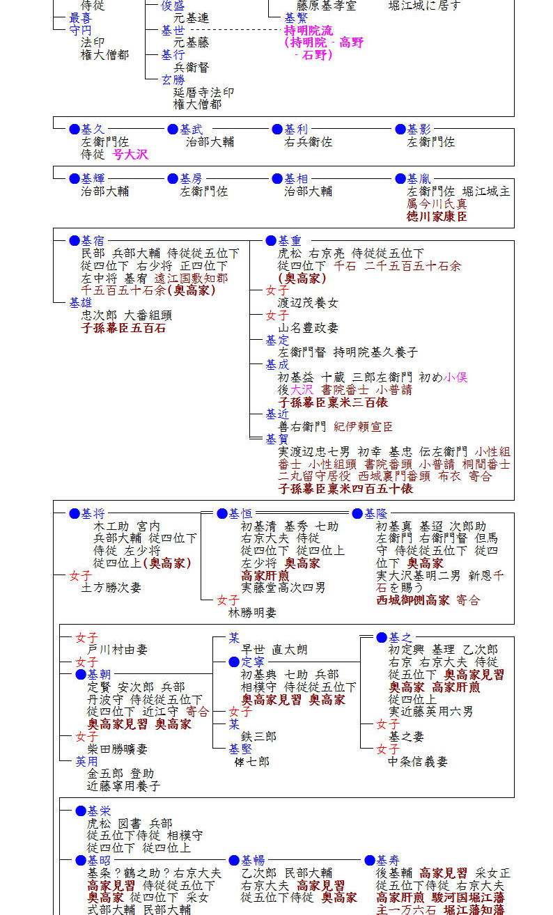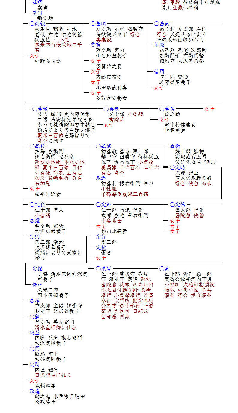 そして大沢宗家だけでなく、分家の基明・基躬(基重の孫)も一時高家に任ぜられることとなります。ただし基明家はその子基実が夭死することで断絶し、基実の従兄弟・英晴が家名を継ぐものの高家の家格は復活せず三百俵の旗本としてその後は続きました。また基躬家は正徳2年(1712)基躬が「痛所あるをもって遠国の御使をうけたまわらず。其餘の事も同僚のごとく勤仕せざるにより職をゆるされ寄合となる」とのことで表高家からは外れました。