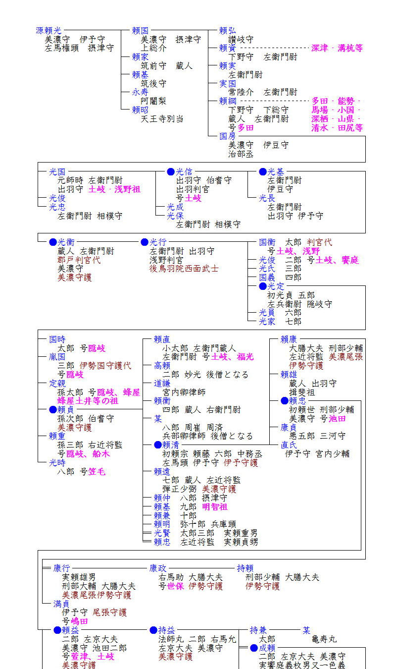 国房の子孫は土岐郡を基盤として私領を広げ、光衡の代には源頼朝の御家人となって承久の変後は美濃国守護となりました。これ以降は美濃源氏の中でも光衡の子孫が勢力を強め、南北朝期の頼貞は足利尊氏に従って鎌倉幕府を討ち美濃守護となりました。頼康の代には尾張・伊勢を合わせ三国の守護となり、養子の康行も三国守護を引き継ぎました。しかし三代将軍義満の宿老の勢力削減策によって幕府より謀反人として征討され、代わって庶流池田家の頼忠が美濃守護となり、以後はその子孫が美濃守護を継承し、美濃国内の武士たちを家臣としていきました。その後は守護代斎藤氏の実力もあって美濃国は安定していましたが、成頼の跡目を嫡子政房と末子元頼で争い、また政房の子の頼純・頼芸(なり)兄弟の争いもあって守護家の声望は衰え、兄頼純を国外に追った頼芸も家臣斎藤道三に美濃国から追われ、越前・甲斐・上総を流浪しました。