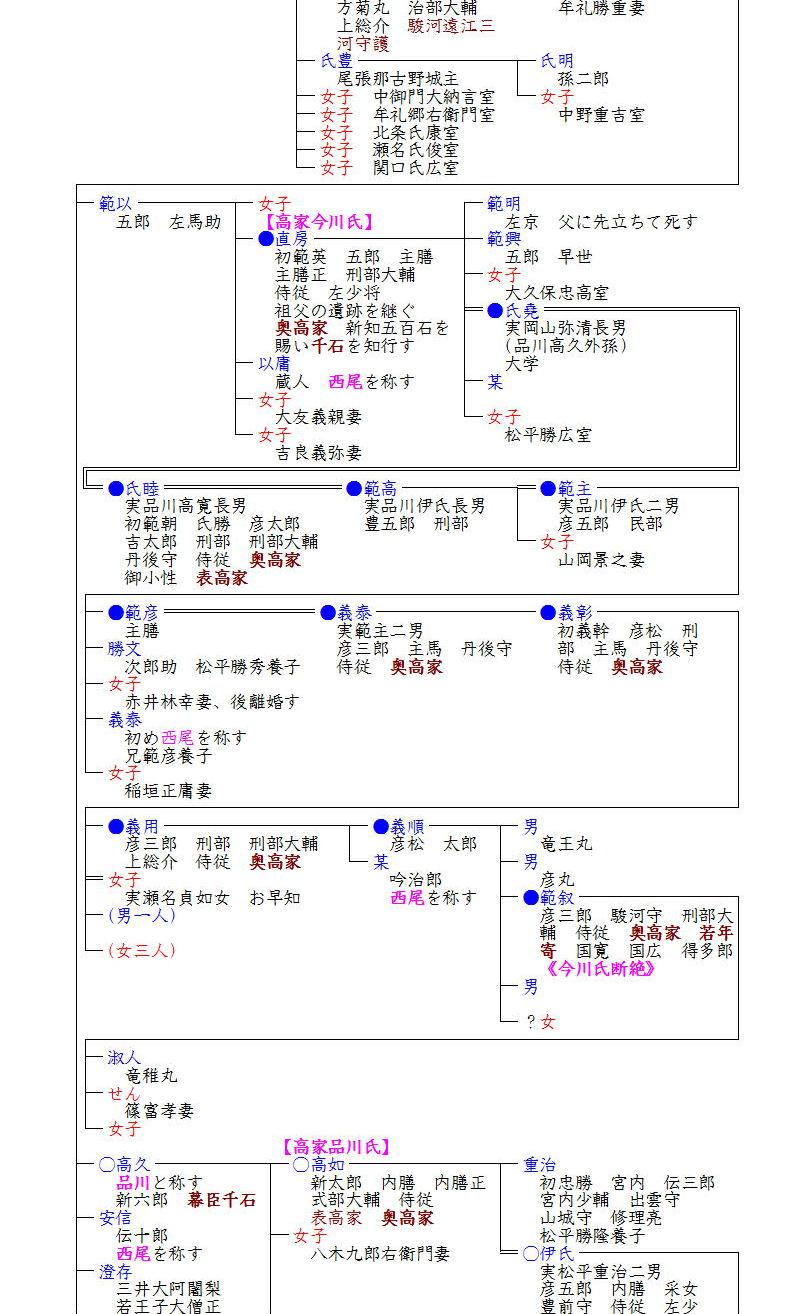 嫡流の今川家が江戸時代高家として存続したように、その他の今川一族も江戸幕臣・旗本として存続していました。氏真の次男高久は、今川の名字は嫡流に限るということから、居所であった江戸品川から品川氏を名乗り、品川氏の直系は千五百石(のち三百石)の高家として、高久の次男・高寛の系統は二百石百俵の旗本として存続しました。