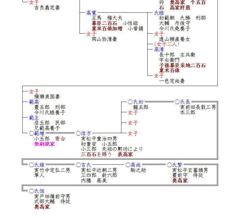 一方、高次の弟高知も厚遇され、まずは義父毛利秀頼の遺領を継ぎ信濃飯田6万石、後10万石に加増され、最終的には丹後宮津12万3000石の大名となります。高知の没後は領地が三分され、宮津に嫡子高広、田辺に庶子高三、峰山に猶子高通が配され、高広は7万8200石を領しました。高広は悪政を敷いたと言われ、隠居し子高国が藩主となりましたが、その後も藩政に介入した父高広と対立し、寛文6年(1666)親子不和や悪政を理由に改易され、高広は京都に閑居し、高国は盛岡藩南部家に、嫡子高(たか)規(のり)は津藩藤堂家に預けられました。高規は延宝8年(1680)に赦免され、元禄3年(1690)には召し出され稟米2000俵を賜い寄合に列し、同8年(1695)には高家に列しのち采地2000石に改められました。同家は以後、二代高甫(たかすけ)・三代高本・六代高以(たかゆき)・八代高福が奥高家を務め維新まで続きました。