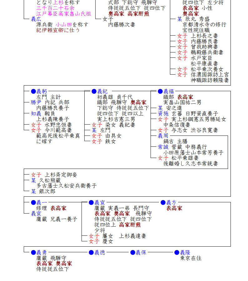 義春の長男・景広の子孫は米沢藩上杉家に仕え代々米沢藩士として続きました。また二男・長員は上杉謙信の恩を受けたことを思い上杉を称し、徳川家康に仕え江戸幕臣旗本となり下総・常陸国内にて1490石余の采地を賜う。二代・長貞の代に奥高家となり、以後長之・義寿・義長と奥高家を務め維新を迎えました。
