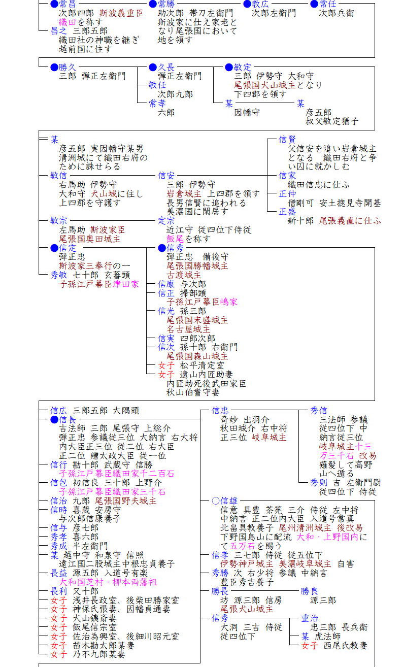 織田氏が越前国織田荘(現福井県越前町織田)の荘官であり、織田剱神社の神官であったのは間違いなく、その後越前の守護斯波氏の被官となったと思われます。それは上記の将広、達勝、あるいは郷広、敏広、寛広など織田家の人々の名乗りが、歴代斯波氏の当主(義将、義郷、義敏、義寛、義達)の偏諱を受けていることからも想像できます。