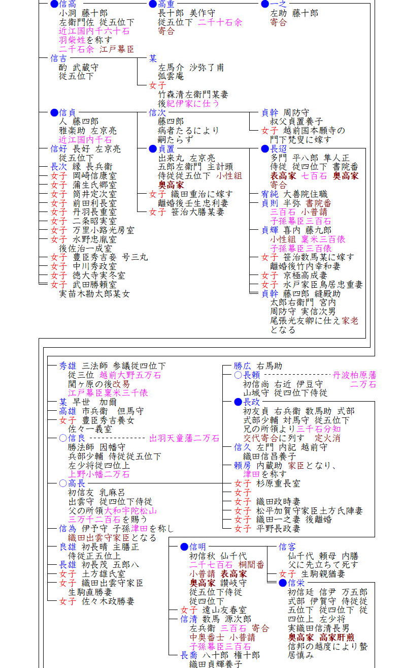 続いて高家となったのは信長の七男信高の系で、信高は本能寺の変後、秀吉に属し、羽柴姓を称して2000石余を知行し、関ヶ原後は弟信貞と同じく家康に仕えました。高家に列したのは4代信門の時で元禄元年(1688)でした。以後、信門・信倉・信直・長裕が奥高家を務め、そのうち信門・信倉は高家肝煎となり、維新まで続きました。ちなみに元フィギュアスケート選手である織田信成は、この信高系織田家の末裔と称していますが、9代信真のあとの系譜が不詳のためその真偽は定かではありません。