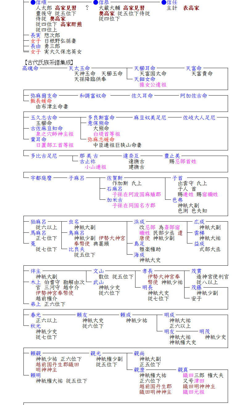 もう一つは忌部(いんべ)氏説で、忌部氏はもともと中臣氏(藤原氏の祖)とともに朝廷の祭祀を司り、各地に広がったが、8世紀には中臣氏に圧されて没落してしまった氏族です。その一族が織田明神の神主となり、織田氏の祖となったというのです。